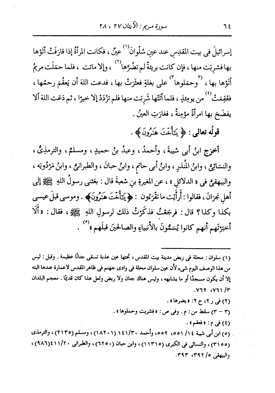 وأخرج ابن أبي شيبة وأحمد ، وعَبد بن حُمَيد ومسلم والترمذي والنسائي ، وَابن المنذر ، وَابن أبي حاتم ، وَابن حبان والطبراني ، وَابن مردويه والبيهقي في الدلائل عن المغيرة بن شعبة قال : بعثني رسول الله صلى الله عليه وسلم إلى أهل نجران فقالوا : أرأيت ما تقرأون يا أخت هارون وموسى قبل عيسى بكذا وكذا : قال : فرجعت فذكرت ذلك لرسول الله صلى الله عليه وسلم ، فقال : ألا أخبرتهم أنهم كانوا يسمون بالأنبياء والصالحين قبلهم.