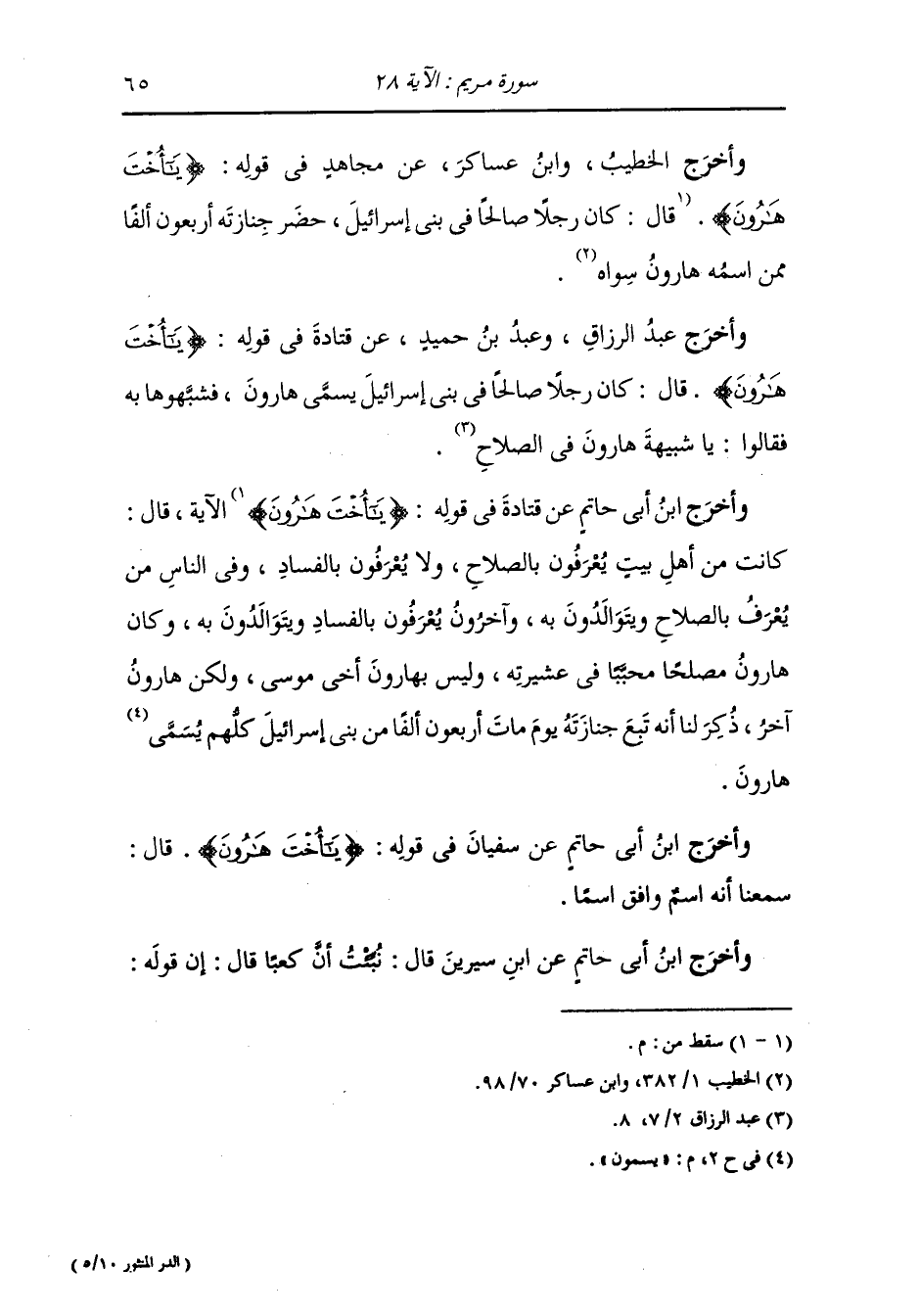 وأخرج الخطيب ، وَابن عساكر عن مجاهد في قوله : {يا أخت هارون} الآية قال : كانت من أهل بيت يعرفون بالصلاح ولا يعرفون بالفساد في الناس وفي الناس من يعرف بالصلاح ويتوالدون به وآخرون يعرفون بالفساد ويتوالدون به وكان هارون مصلحا محببا في عشيرته وليس بهرون أخي موسى ولكن هرون آخر ، ذكر لنا أنه تبع جنازته يوم مات أربعون ألفا من بني إسرائيل كلهم يسمون هرون.