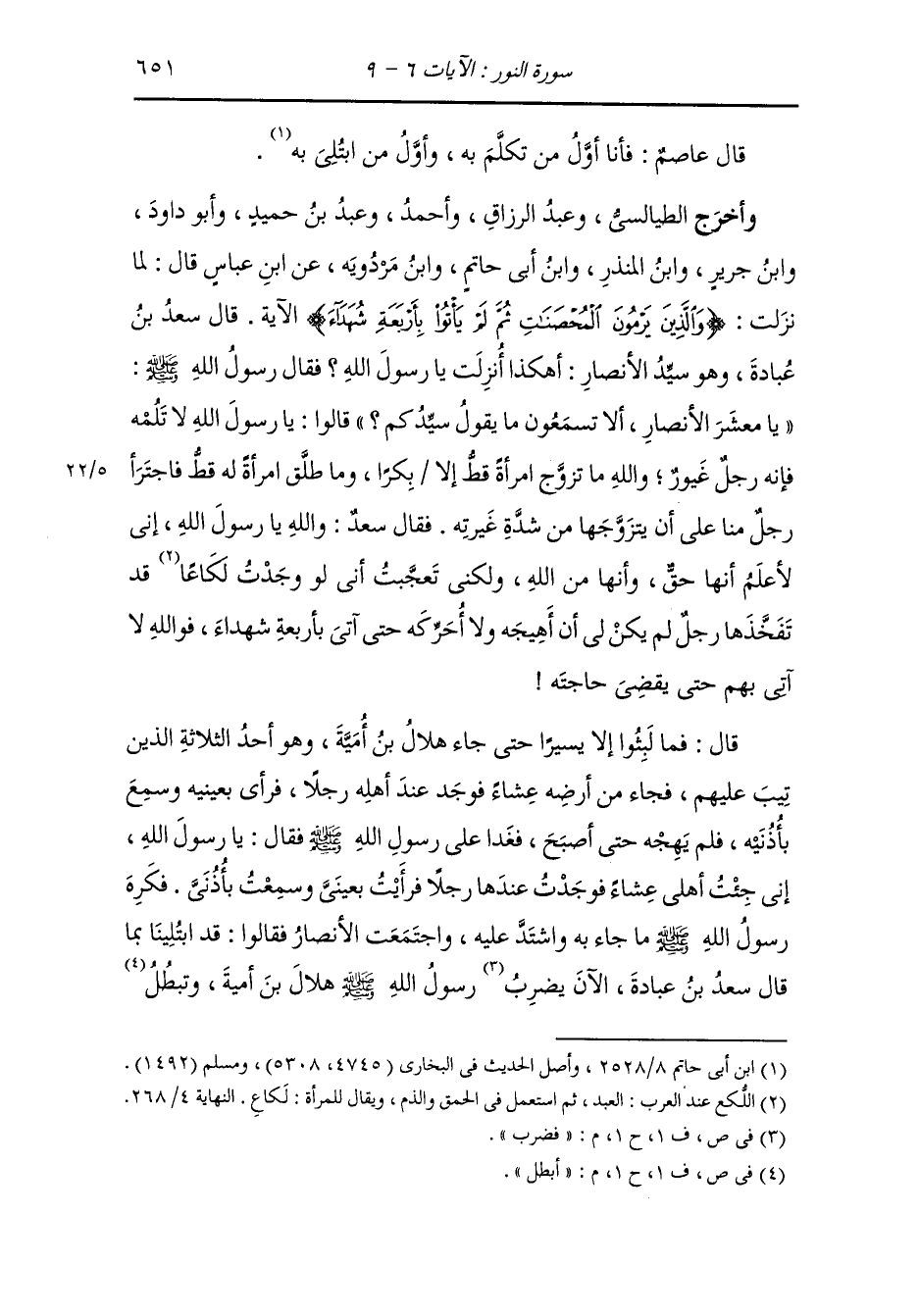 إخواننا من بني الخزرج أمرتنا ففعلنا أمرك فقام سعد بن عبادة وهو سيد الخزرج وكان قبل ذلك رجلا صالحا ولكن احتملته الحميه فقال لسعد : كذبت لعمر الله ما تقتله ولا تقدر على قتله ، فقام أسيد بن حضير وهو ابن عم سعد فقال لسعد بن عبادة : كذبت لنقتلنه فانك منافق تجادل عن المنافقين ، فتثاور الحيان الأوس والخزرج حتى هموا ان يقتتلوا ورسول الله صلى الله عليه وسلم قائم على المنبر فلم يزل رسول الله صلى الله عليه وسلم يخفضهم حتى سكتوا وسكت ، فبكيت يومي ذلك فلا يرقا لي دمع ولا أكتحل بنوم فأصبح أبواي عندي وقد بكيت ليلتين ويوما لا أكتحل بنوم ولا يرقا لي دمع وأبواي يظنان ان البكاء فالق كبدي ، فبينما هما جالسان عندي وأنا ابكي فاستأذنت على امرأة من الانصار فأذنت لها فجلست تبكي معي فبينا نحن على ذلك دخل علينا رسول الله صلى الله عليه وسلم ثم جلس ولم يجلس عندي منذ قيل في ما قيل قبلها وقد لبث شهرا لا يوحي إليه في شأني بشيء فتشهد حين جلس ثم قال : أما بعد يا عائشة فانه بلغني عنك كذا وكذا ، فان كنت بريئه فسيبرئك الله وإن كنت ألممت بذنب فاستغفري الله وتوبي إليه فإن العبد اذا اعترف بذنبه ثم تاب تاب الله عليه ، فلما قضى رسول الله صلى الله عليه وسلم مقالته قلص دمعي حتى ما أحس