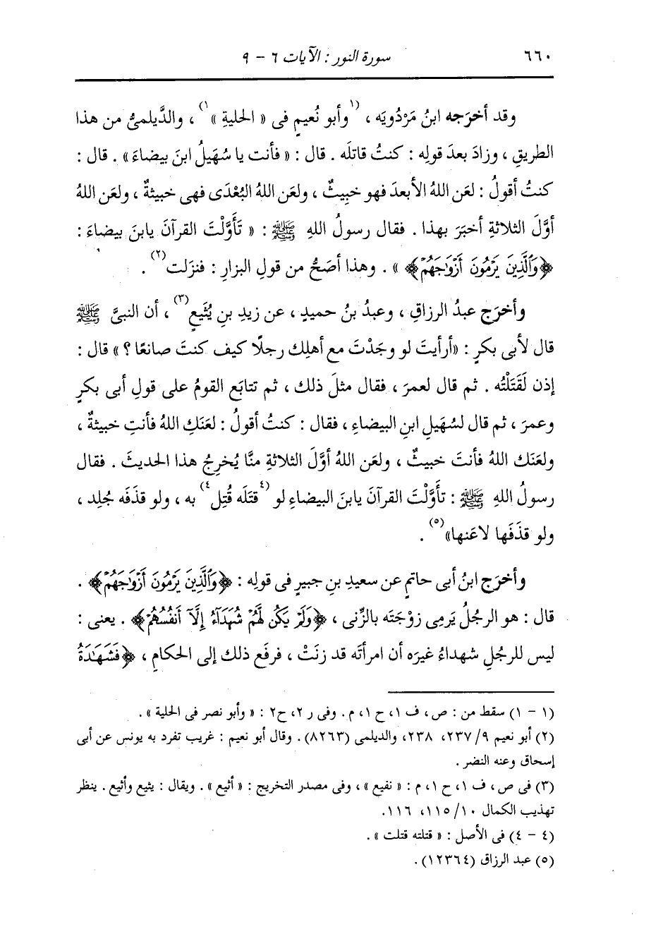 وأخرج الطبراني ، وَابن مردويه بسنده عن عمر قال : كان رسول الله صلى الله عليه وسلم اذا أراد سفرا أقرع بين نسائه ثلاثا فمن أصابته القرعة خرج بها معه فلما غزا بني المصطلق اقرع بينهن فأصابت عائشة وأم سلمة فخرج بهما معه فلما كانوا في بعض الطريق مال رحل أم سلمة فاناخوا بعيرها ليصلحوا رحلها وكانت عائشة تريد قضاء حاجة فلما أبركوا ابلهم قالت عائشة : فقلت في نفسي إلى ما يصلح رحل أم سلمة أقضي حاجتي ، قالت : فنزلت من