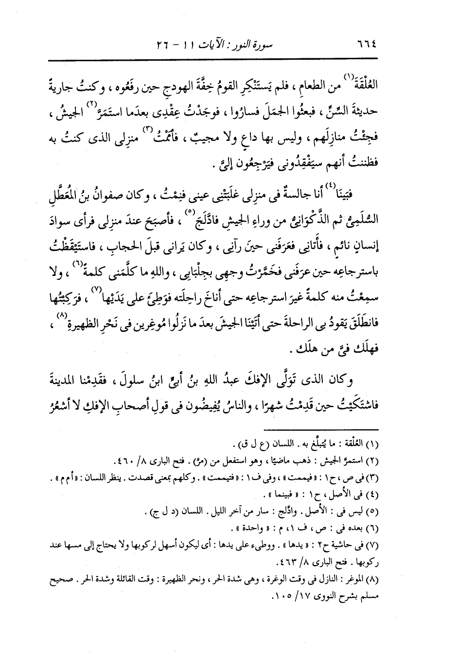 يا بريرة قالت والله يا رسول الله ما علمت على أهلك إلا خيرا إلا أنها امرأة نؤم تنام حتى تجيء الداجن فتأكل عجينها وان كان شيء من هذا ليخبرنك الله ، فخرج صلى الله عليه وسلم حتى أتى منزل أبي بكر فدخل عليها فقال : يا عائشة ان كنت فعلت هذا الامر فقولي لي حتى أستغفر الله لك فقالت : والله لا أستغفر الله منه أبدا ، ان كنت قد فعلته فلا غفر الله لي وما أجد مثلي ومثلكم إلا مثل أبي يوسف اذهب اسم يعقوب من الأسف قال {إنما أشكو بثي وحزني إلى الله وأعلم من الله ما لا تعلمون} يوسف الآية 86 ، فبينا رسول الله صلى الله عليه وسلم يكلمها اذ نزل جبريل بالوحي فأخذت النَّبِيّ صلى الله عليه وسلم نعسة فسري وهو يتبسم فقال : يا عائشة ان الله قد أنزل عذرك فقالت : بحمد الله بحمدك ، فتلا عليها سورة النور إلى الموضع الذي انتهى إليه عذرها وبراءتها فقال رسول الله صلى الله عليه وسلم ك قومي إلى البيت فقامت ، وخرج رسول الله صلى الله عليه وسلم إلى المسجد فدعا أبا عبيدة بن الجراح فجمع الناس ثم تلا عليهم ما أنزل الله من البراءة لعائشة وبعث إلى عبد الله بن