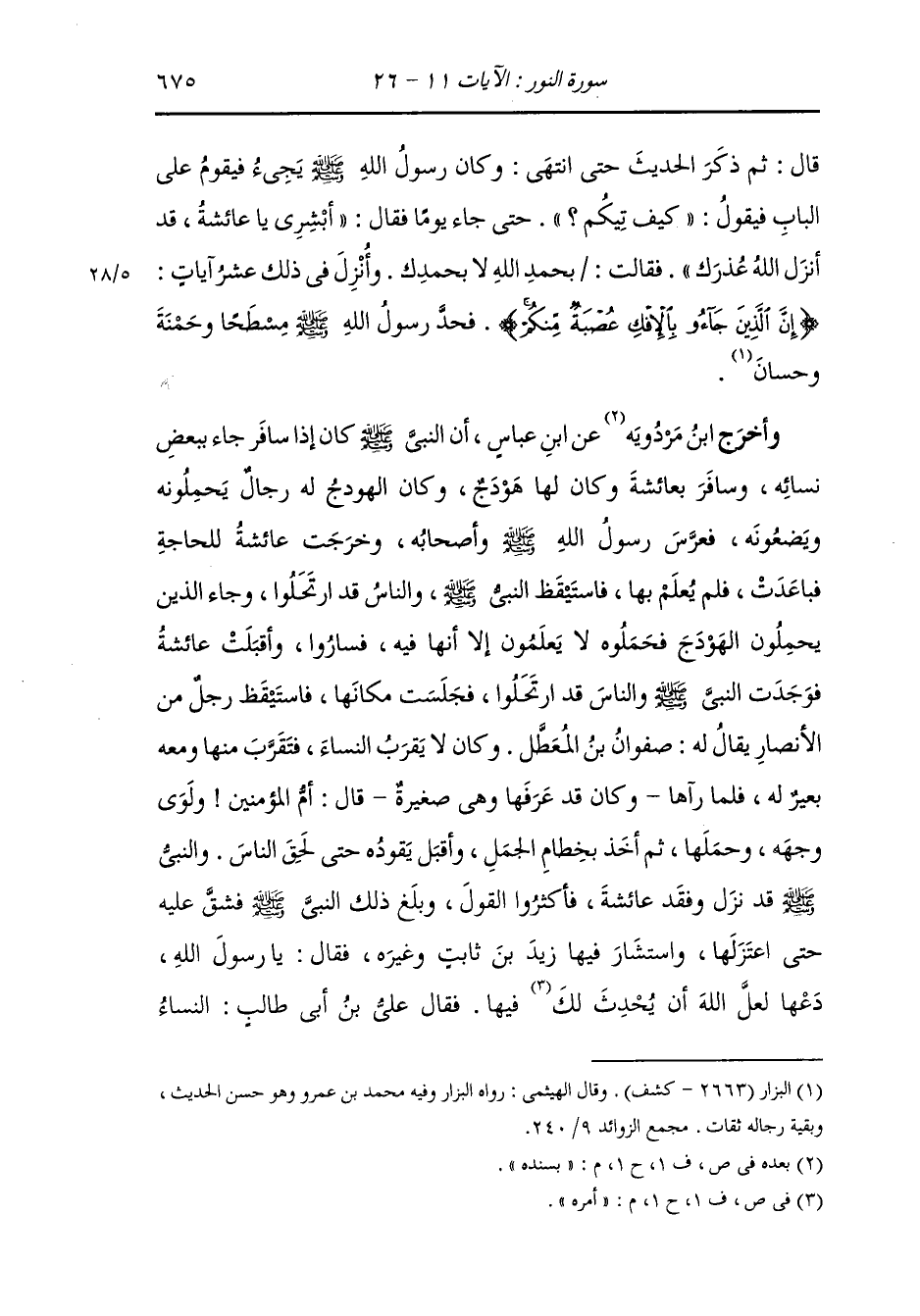 السماء قالت : فاتاني أبي وهو يعدو يكاد أن يعثر فقال : ابشري يا بنية بأبي وأمي فان الله قد أنزل عذرك قلت : بحمد الله لا بحمدك ولا بحمد صاحبك الذي أرسلك ثم دخل رسول الله صلى الله عليه وسلم فتناول ذراعي فقلت بيده هكذا فأخذ أبو بكر النعل ليعلوني بها فمنعته أمي فضحك رسول الله صلى الله عليه وسلم فقال : أقسمت لا تفعل.