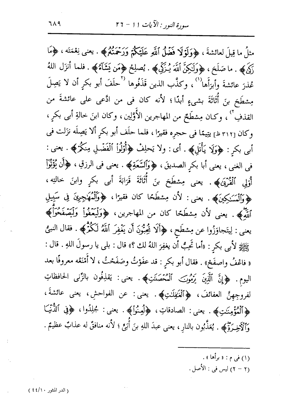 أذاع فلما أنزل الله براءتها وعذرها تألى أبو بكر لا يرزؤه خيرا فأنزل الله هذه الآية ، فذكر لنا أن نبي الله صلى الله عليه وسلم دعا أبا بكر فتلاها عليه فقال : ألا تحب أن يغفر الله لك قال : بلى قال : فاعف عنه وتجاوز فقال أبو بكر : لا جرم ، والله لا أمنعه معروفا كنت أوليه قبل اليوم.