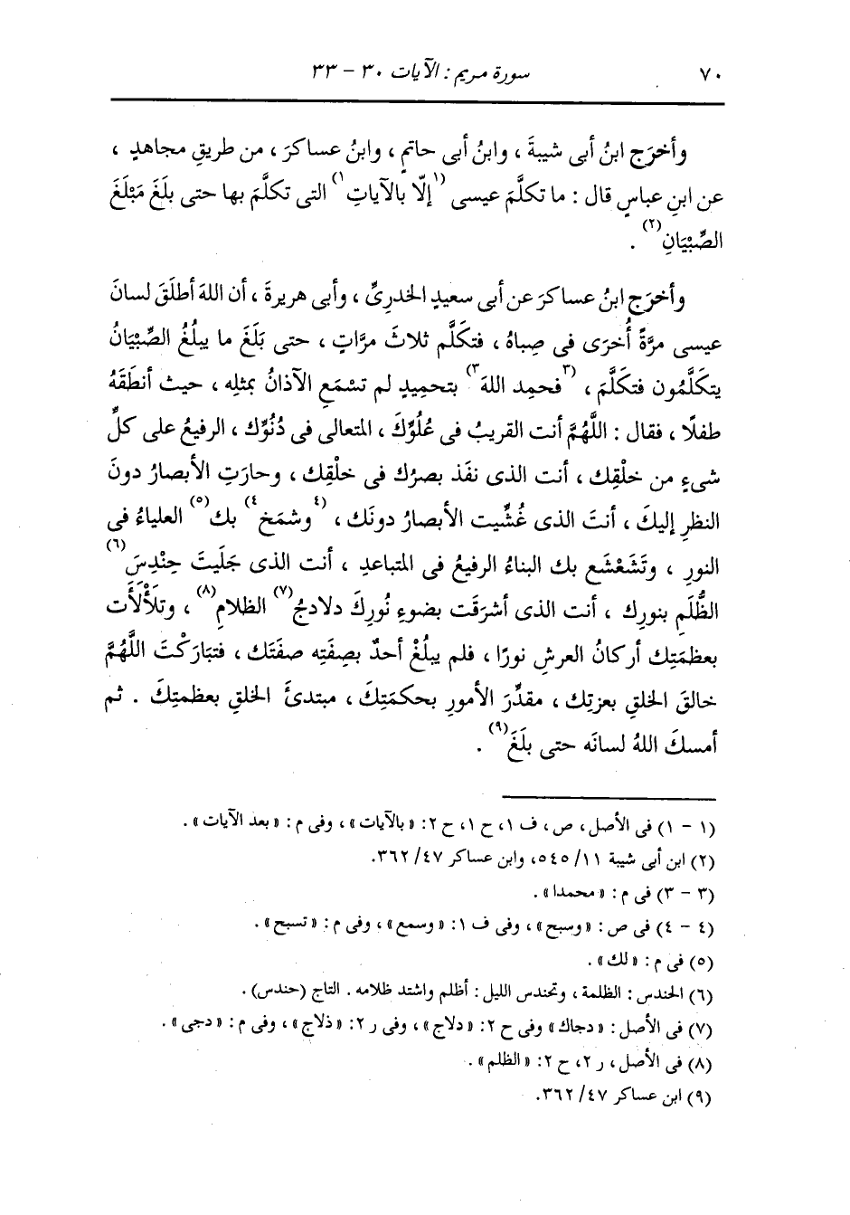 وأخرج ابن عساكر عن أبي سعيد الخدري وأبي هريرة أن الله أطلق لسان عيسى مرة أخرى في صباه فتكلم ثلاث مرات حتى بلغ ما بلغ الصبيان يتكلمون فتكلم محمدا بتحميد لم تسمع الآذان مثله حيث أنطقه طفلا فقال : اللهم أنت القريب في علوك المتعالي في دنوك الرفيع على كل شيء من خلقك أنت الذي نفذ بصرك في خلقك وحارت الأبصار دون النظر إليك أنت الذي أشرقت بضوء نورك دجى الظلام وتلألأت بعظمتك أركان العرش نورا فلم يبلغ أحد بصفته صفتك فتباركت اللهم خالق الخلق بعزتك مقدر الأمور بحكمتك مبتدئ الخلق بعظمتك ثم أمسك الله لسانه حتى بلغ.