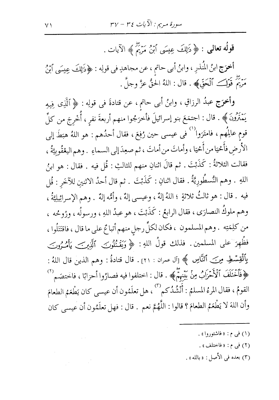 وأخرج عبد الرزاق ، وَابن أبي حاتم عن قتادة في قوله : {الذي فيه يمترون} قال : اجتمع بنو إسرائيل فأخرجوا منهم أربعة نفر أخرج من كل قوم عالمهم فتشاوروا في عيسى حين رفع فقال أحدهم : هو الله هبط إلى الأرض فأحيى من أحيى وأمات من أمات ثم صعد إلى السماء وهم اليعقوبية فقالت الثلاثة : كذبت ، ثم قال اثنان منهم للثالث : قل فيه ، فقال : هو ابن الله وهم النسطورية ، فقال اثنان : كذبت ، ثم قال أحد الاثنين للآخر : قل فيه ، قال : هو ثالث ثلاثة : الله إله وعيسى إله وأمه إله ، وهم الإسرائيلية وهم ملوك النصارى ، فقال الرابع : كذبت ، هو عبد الله ورسوله وروحه من كلمته وهم المسلمون فكان لكل رجل منهم أتباع على ما قال فاقتتلوا فظهر على المسلمين ، فذلك قول الله :