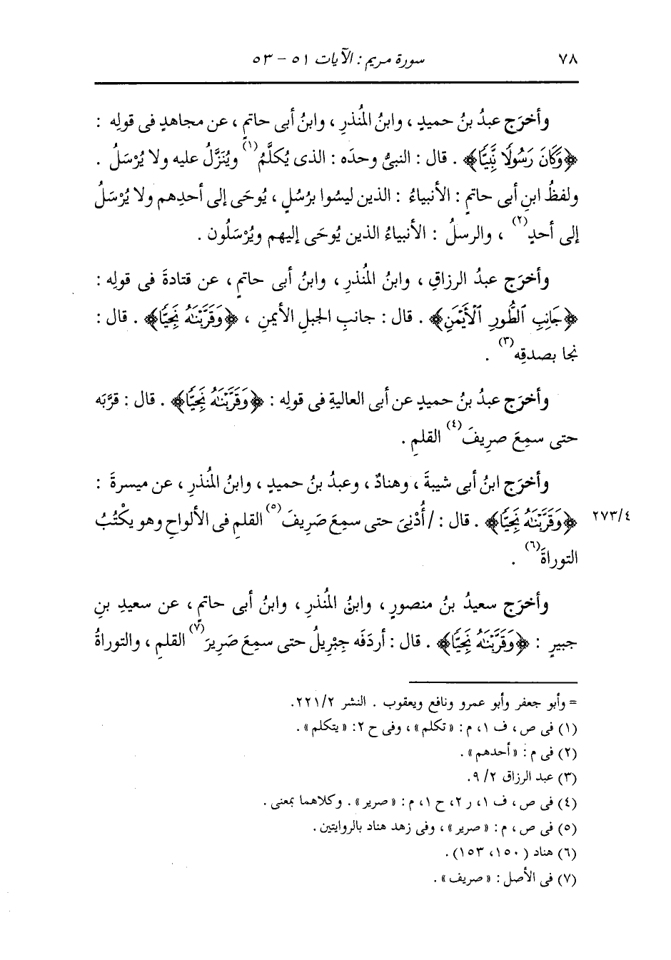 وأخرج عَبد بن حُمَيد عن أبي العالية في قوله : {وقربناه نجيا} قال : قربه حتى سمع صرير القلم.