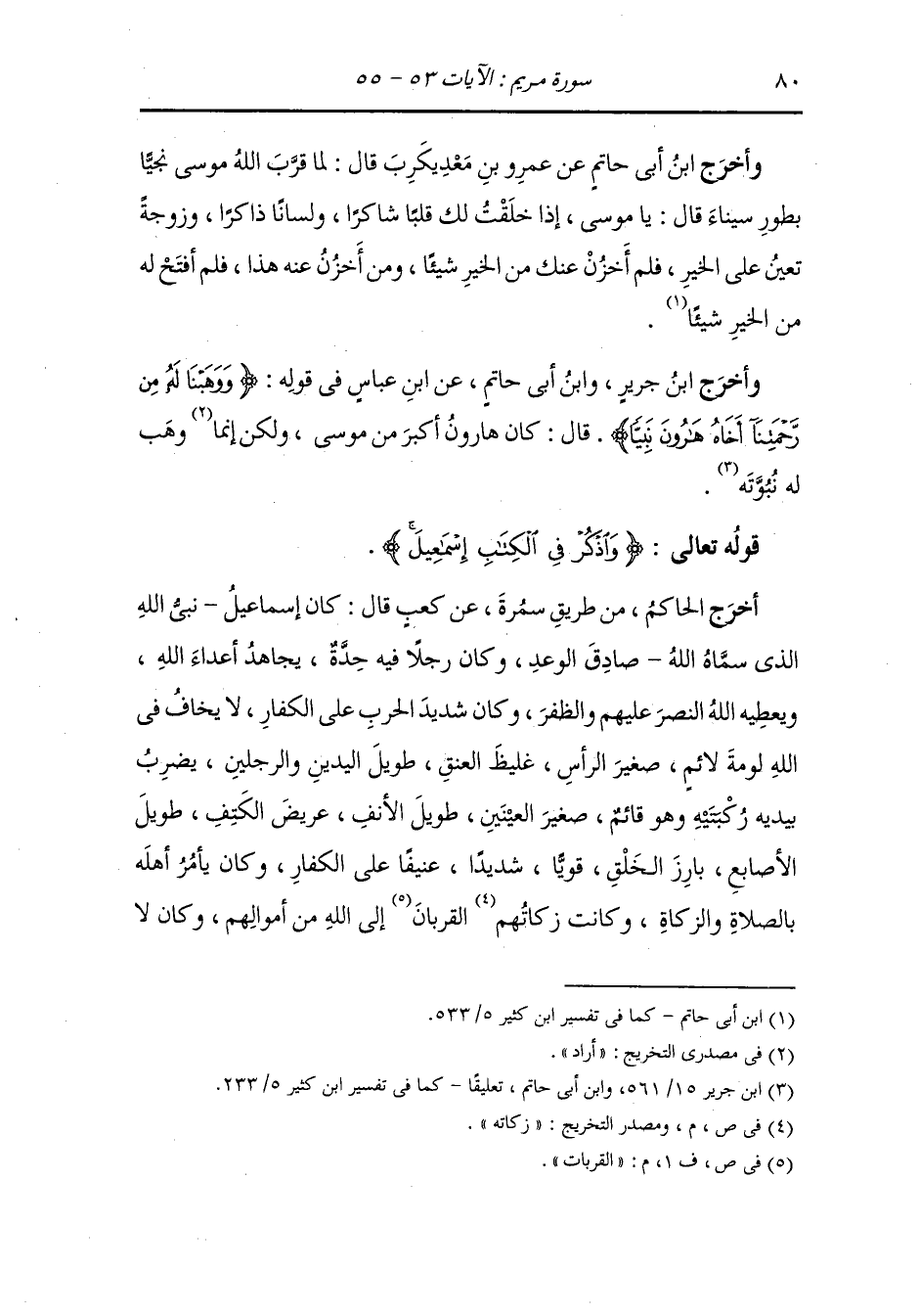 أَخرَج الحاكم من طريق سمرة عن كعب قال : كان إسماعيل نبي الله الذي سماه صادق الوعد وكان رجلا فيه حدة مجاهدا أعداء الله ويعطيه الله النصر عليهم والظفر وكان شديد الحرب على الكفار لا يخاف في الله لومة لائم صغير الرأس غليظ العنق طويل اليدين والرجلين يضرب بيديه ركبتيه وهو قائم صغير العينين طويل الأنف عريض الكتف طويل الأصابع بارز الخلق قوي شديد عنيف على الكفار وكان يأمر أهله بالصلاة والزكاة وكانت زكاته القربات إلى الله من أموالهم وكان لا