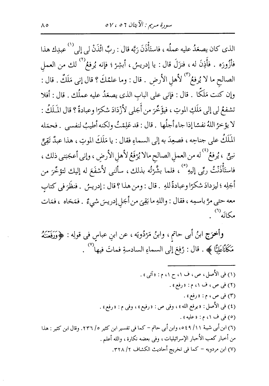الذي كان يصعد عليه عمله فاستأذن ربه قال : رب ائذن لي آتي عبدك هذا فأزوره فأذن له فنزل قال : يا إدريس أبشر فإنه رفع لك من العمل الصالح ما لا رفع لأهل الأرض قال : وما علمك قال إني ملك ، قال : وإن كنت ملكا قال : فإني على الباب الذي يصعد عليه عملك ، قال : أفلا تشفع إلى ملك الموت فيؤخر من أجلي لأزداد شكرا وعبادة قال الملك : (لن يؤخر الله نفسا غذا جاء أجلها) (المنافقون آية 11) قال : قد علمت ولكنه أطيب لنفسي فحمله الملك على جناحيه فصعد به إلى السماء فقال : يا ملك الموت هذا عبد تقي نبي رفع له من العمل الصالح ما لا يرفع لأهل الأرض وإني أعجبني ذلك فاستأذنت ربي عليه فلما بشرته بذلك سألني لأشفع له إليك لتؤخر له من أجله ليزداد شكرا وعبادة ، قال : ومن هذا قال : إدريس فنظر في كتاب معه حتى مر باسمه فقال : والله ما بقي من أجل إدريس شيء فمحاه فمات مكانه.