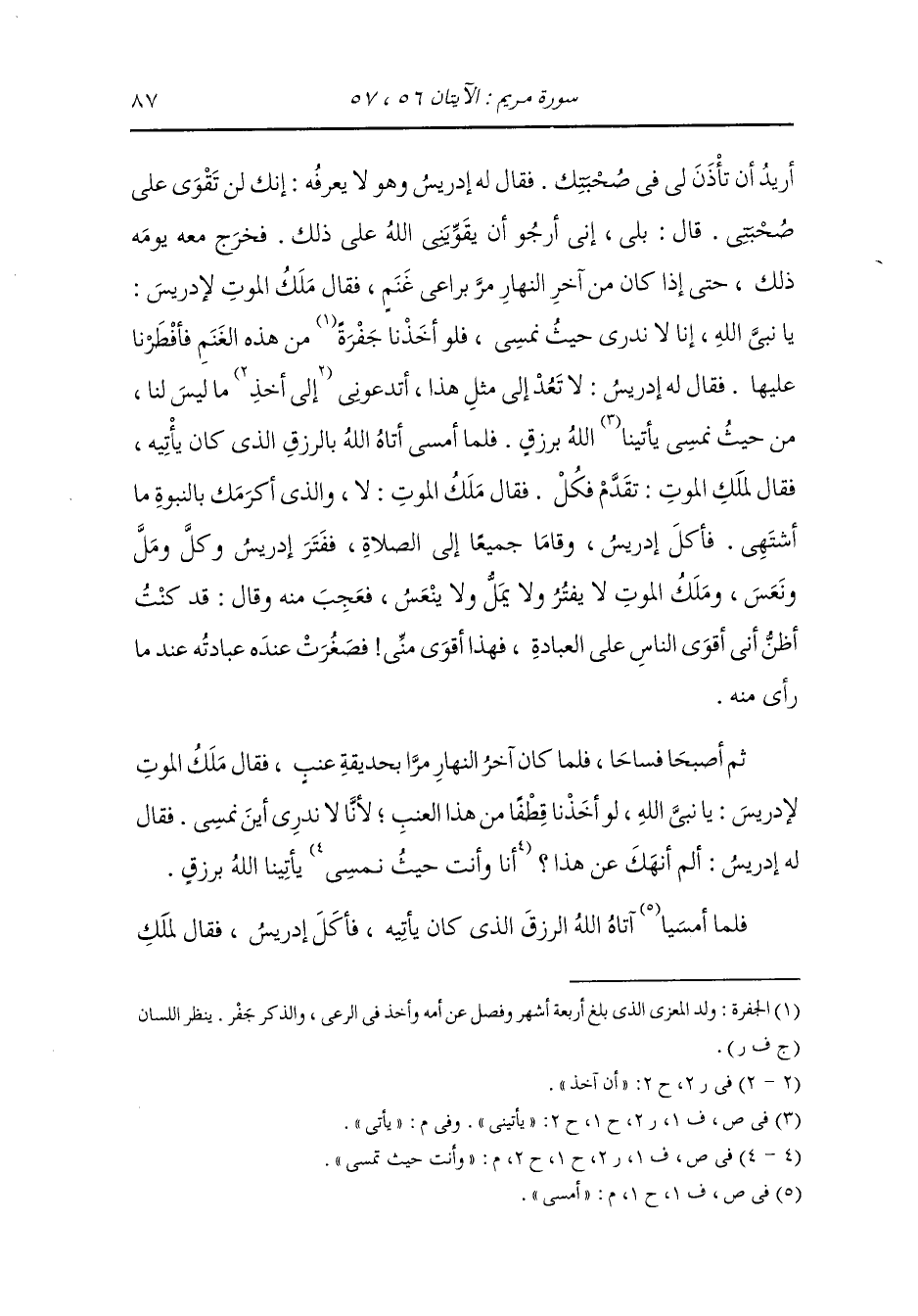 أريد أن تأذن لي في صحبتك ، فقال له إدريس - وهو لا يعرفه - : إنك لن تقوى على صحبتي ، قال : بلى إني أرجو أن يقويني الله على ذلك ، فخرج معه يومه ذلك حتى إذا كان من آخر النهار مر براعي غنم فقال ملك الموت لإدريس : يا نبي الله إنا لا ندري حيث نمسي فلو أخذنا جفرة من هذه الغنم فأفطرنا عليها فقال له إدريس : لا تعد إلى مثل هذا تدعوني إلى أخذ ما ليس لنا من حيث نمسي يأتي الله برزق فلما أمسى أتاه الله بالرزق الذي كان يأتيه فقال لملك الموت : تقدم فكل ، فقال ملك الموت : لا والذي أكرمك بالنبوة ما أشتهي ، فأكل ادريس وقاما جميعا إلى الصلاة ففتر إدريس وكل ومل ونعس وملك الموت لا يفتر ولا يمل ولا ينعس فعجب منه وقال : قد كنت أظن أني أقوى الناس على العبادة فهذا أقوى مني فصغرت عنده عبادته عندما رأى منه ، ثم أصبحا فساحا فلما كان آخر النهار مرا بحديقة عنب فقال ملك الموت لإدريس : يا نبي الله لو أخذنا قطفا من هذا العنب لأنا لا ندري حيث نمسي ، فقال إدريس : ألم أنهك عن هذا وأنت حيث تمسي يأتينا الله برزق فلما أمسى أتاه الله الرزق الذي كان يأتيه فأكل إدريس فقال لملك