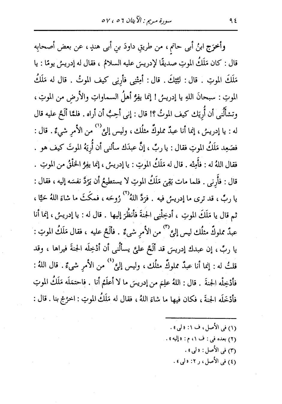 وأخرج ابن أبي حاتم من طريق داود بن أبي هند عن بعض أصحابه قال : كان ملك الموت صديقا لإدريس عليه السلام فقال له إدريس يوما : يا ملك الموت قال : لبيك ، قال : أمتني فأرني كيف الموت قال له ملك الموت : سبحان الله يا إدريس إنما يفر أهل السموات والأرض من الموت وتسألني أن أريك كيف الموت قال : إني أحب أن أراه فلما ألح عليه قال له : يا إدريس أنا عبد مملوك مثلك وليس إلي من الأمر شيء ، قال : فصعد ملك الموت فقال : رب إن عبدك سألني أن أريه الموت كيف هو قال الله له : فأمته ، فقال له ملك الموت : يا إدريس إنما يفر الخلق من الموت قال : فأرني ، فلما مات بقي ملك الموت لا يستطيع أن يرد نفسه إليه فقال : يا رب قد ترى ما إدريس فيه فرد الله إليه روحه فمكث ما شاء حيا ثم قال يا ملك الموت : أدخلني الجنة فأنظر إليها قال له : يا إدريس إنما أنا عبد مملوك مثلك ليس إلي من الأمر شيء فألح عليه فقال ملك الموت : يا رب إن عبد إدريس قد ألح علي فسألني أن أدخله الجنة فيراها وقد قلت له : إنما أنا عبد مثلك وليس إلي من الأمر شيء ، قال الله : فأدخله الجنة قال : إن الله علم من إدريس ما لا أعلم أنا فاحتمله ملك الموت فأدخله الجنة فكان فيها ما شاء الله فقال له ملك الموت : اخرج بنا ، قال :
