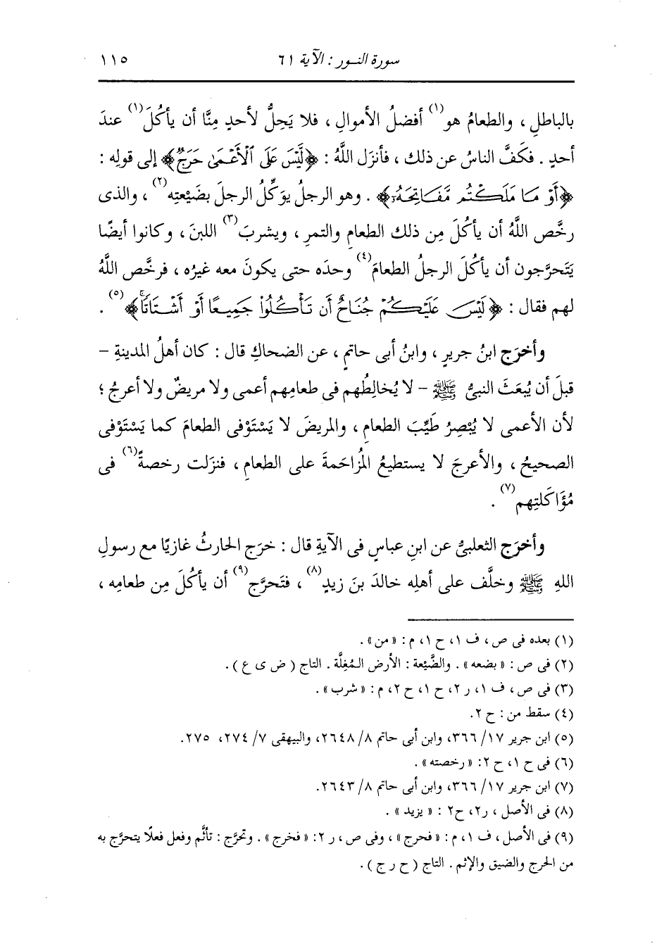 بالباطل والطعام هو من أفضل الأموال فلا يحل لأحد منا ان يأكل من عند أحد ، فكف الناس عن ذلك فأنزل الله {ليس على الأعمى حرج} إلى قوله {أو ما ملكتم مفاتحه} وهو الرجل يوكل الرجل بضيعته والذي رخص الله ان يأكل من ذلك الطعام والتمر وشرب اللبن وكانوا أيضا يتحرجون أن يأكل الرجل الطعام وحده حتى يكون معه غيره فرخص الله لهم فقال {ليس عليكم جناح أن تأكلوا جميعا أو أشتاتا}.
