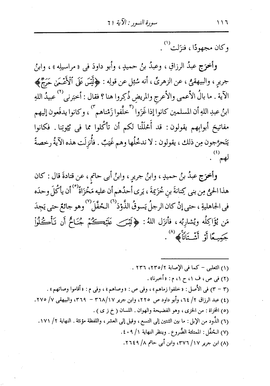 وأخرج عَبد بن حُمَيد ، وَابن جَرِير ، وَابن أبي حاتم عن قتادة قال : كان هذا الحي من بني كنانة بن خزيمة يرى أحدهم ان عليه مخزاة أن يأكل وحده في الجاهلية حتى ان كان الرجل يسوق الذود الحفل وهو جائع حتى يجد من يؤاكله ويشاربه فأنزل الله {ليس عليكم جناح أن تأكلوا جميعا أو أشتاتا}.