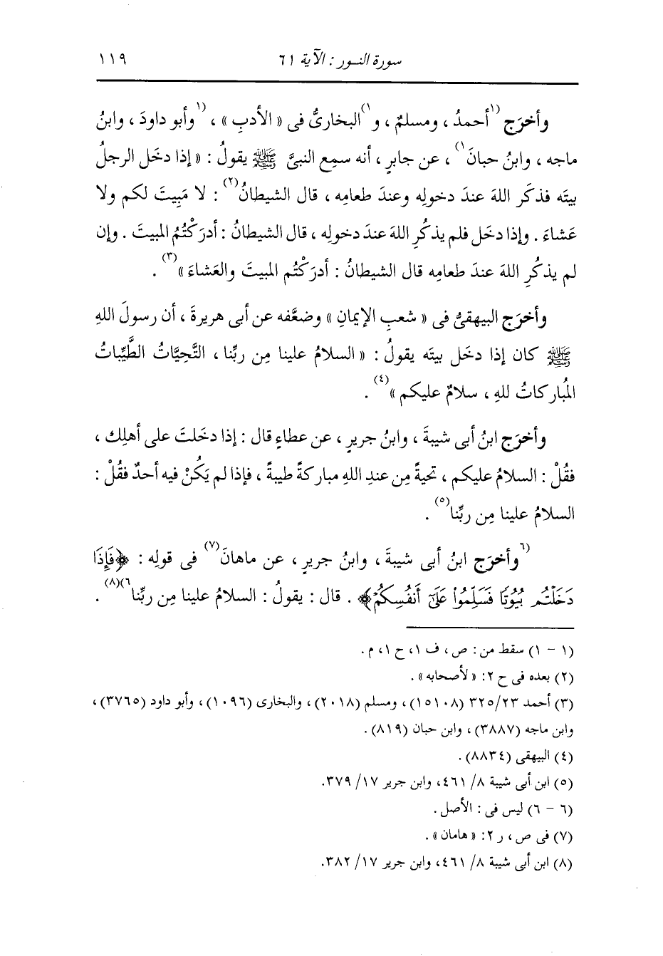 وأخرج ابن أبي شيبة ، وَابن جَرِير عن عطاء قال : اذا دخلت على أهلك فقل : السلام عليكم تحية من عند الله مباركة طيبة فاذا لم يكن فيه أحد فقل : السلام علينا من ربنا.