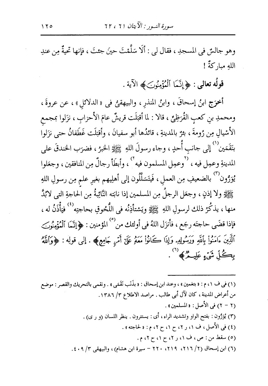 أخرج ابن إسحاق ، وَابن المنذر والبيهقي في الدلائل عن عروة ومحمد بن كعب القرظي قالا : لما أقبلت قريش عام الاحزاب نزلوا بمجمع الاسيال من بئر رومة بالمدينة قائدها أبو سفيان وأقبلت غطفان حتى نزلوا بتغمين إلى جانب أحد وجاء رسول الله صلى الله عليه وسلم الخبر وضرب الخندق على المدينة وعمل فيه وعمل المسلمون فيه وابطأ رجال من المنافقين وجعلوا يورون بالضعيف من العمل فيتسللون إلى أهليهم بغير علم من رسول الله صلى الله عليه وسلم ولا اذن وجعل الرجل من المسلمين اذا نابته النائبة من الحاجة التي لابد منها يذكر ذلك لرسول الله صلى الله عليه وسلم ويستأذنه في اللحوق لحاجته فيأذن له فاذا قضى حاجته رجع فأنزل الله في أولئك المؤمنين {إنما المؤمنون الذين آمنوا بالله ورسوله وإذا كانوا معه على أمر جامع} إلى قوله {والله بكل شيء عليم} النور الآية 64.