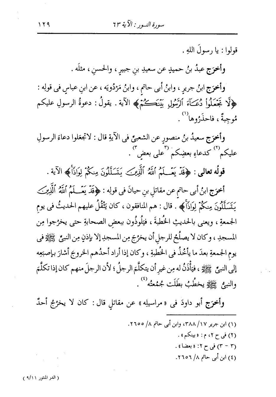 وأخرج ابن جرير ، وَابن أبي حاتم ، وَابن مردويه عن ابن عباس في قوله {لا تجعلوا دعاء الرسول بينكم} يقول : دعوة الرسول عليكم موجبة فاحذرها.