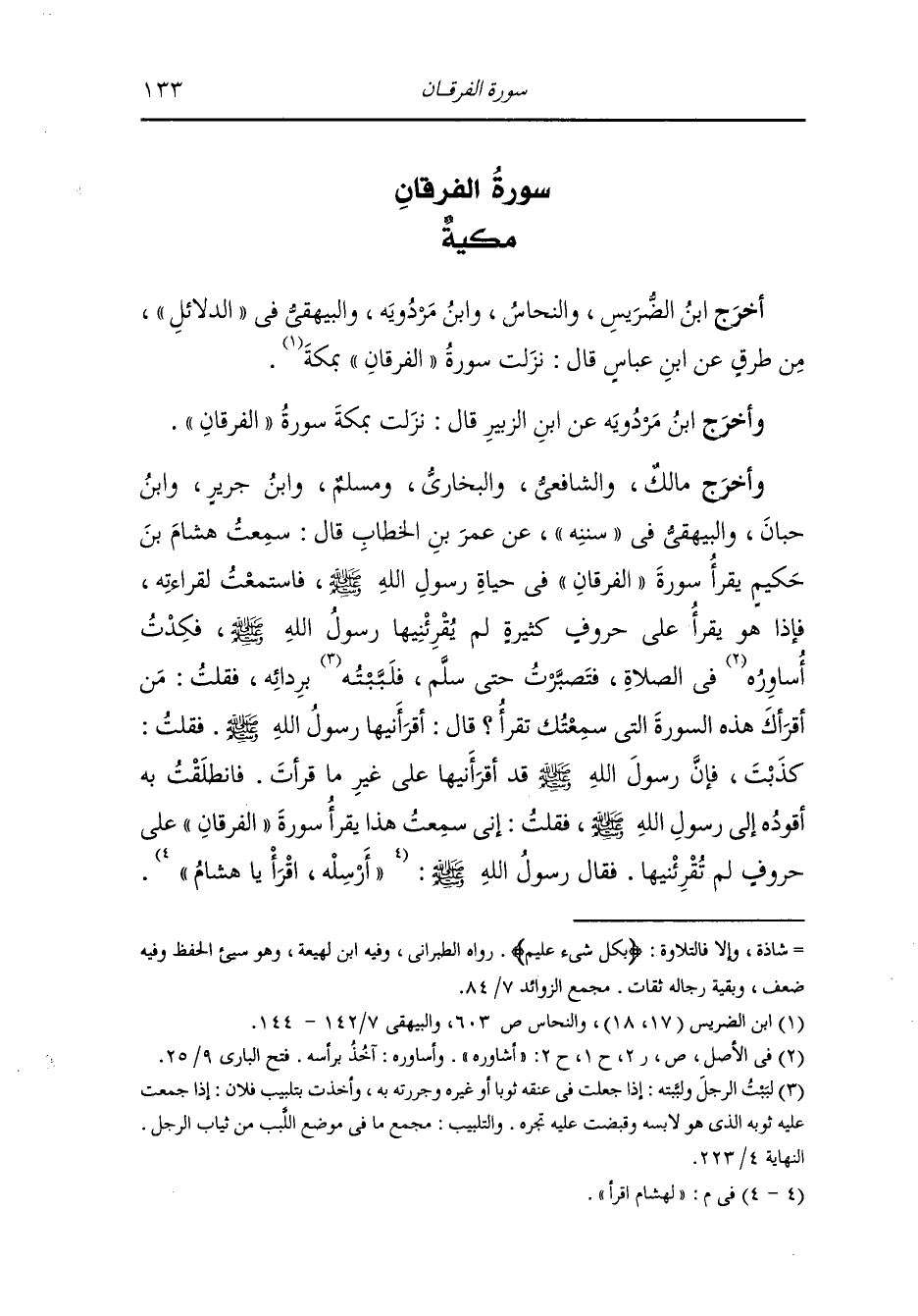 وأخرج مالك والشافعي والبخاري ومسلم ، وَابن جَرِير ، وَابن حبان والبيهقي في "سُنَنِه" عن عمر بن الخطاب قال : سمعت هشام بن حكيم يقرأ سورة الفرقان في حياة رسول الله صلى الله عليه وسلم فاستمعت لقراءته فاذا هو يقرأ على حروف كثيرة لم يقرئنيها رسول الله صلى الله عليه وسلم فكدت أساوره في الصلاة فتصبرت حتى سلم فلببته بردائه فقلت : من أقرأك هذه السورة التي سمعتك تقرأ قال : أقرأنيها رسول الله صلى الله عليه وسلم فقلت : كذبت ، فان رسول الله صلى الله عليه وسلم أقرأنيها على غير ما قرأت فانطلقت به أقوده إلى رسول الله صلى الله عليه وسلم فقلت : اني سمعت هذا يقرأ سورة الفرقان على حروف لم تقرئنيها فقال رسول الله صلى الله عليه وسلم لهشام : اقرأ.