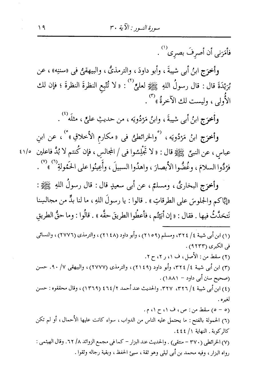 وأخرج ابن أبي شيبة وأبو داود والترمذي والبيهقي في "سُنَنِه" عن بريدة قال : قال رسول الله صلى الله عليه وسلم لعلي لاتتبع النظرة النظرة فان لك الاولى وليست لك الآخرة.
