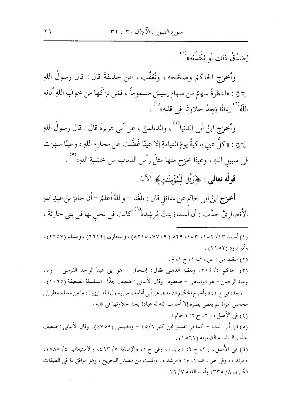 - قوله تعالى : وقل للمؤمنات يغضضن من أبصارهن ويحفظن فروجهن ولا يبدين زينتهن إلا ما ظهر منها وليضربن بخمرهن على جيوبهن ولا يبدين زينتهن إلا لبعولتهن أو آبائهن أو آباء بعولتهن أو أبنائهن أو أبناء بعولتهن أو إخوانهن أو بني إخوانهن أو بني أخواتهن أو نسائهن أو ما ملكت