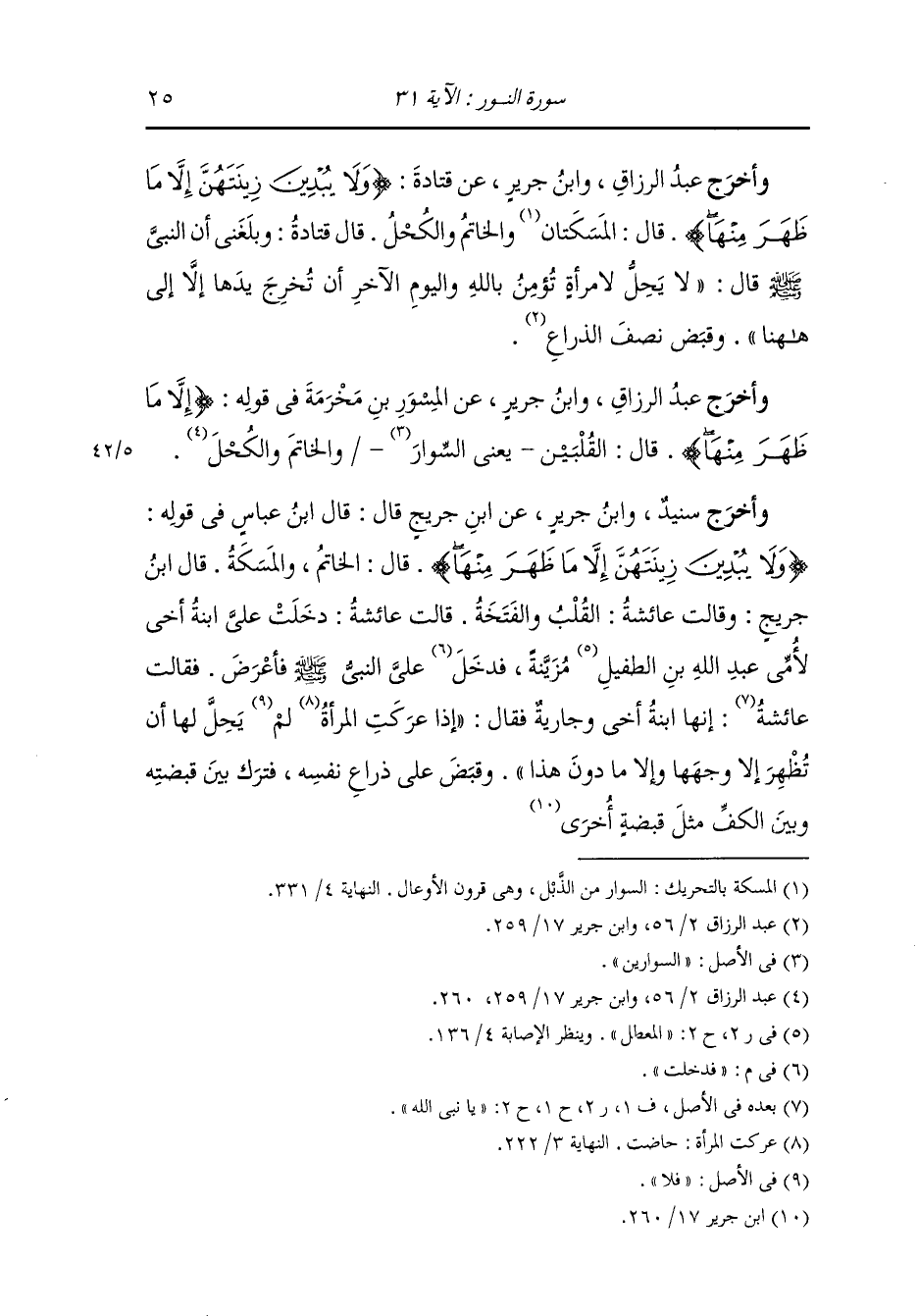 وأخرج عبد الرزاق ، وَابن جَرِير عن قتادة {ولا يبدين زينتهن إلا ما ظهر منها} قال : المسكتان والخاتم والكحل قال قتادة : وبلغني ان النَّبِيّ صلى الله عليه وسلم قال لا يحل لامرأة تؤمن بالله واليوم الآخر أن تخرج يدها إلا إلى ههنا ويقبض نصف الذراع.