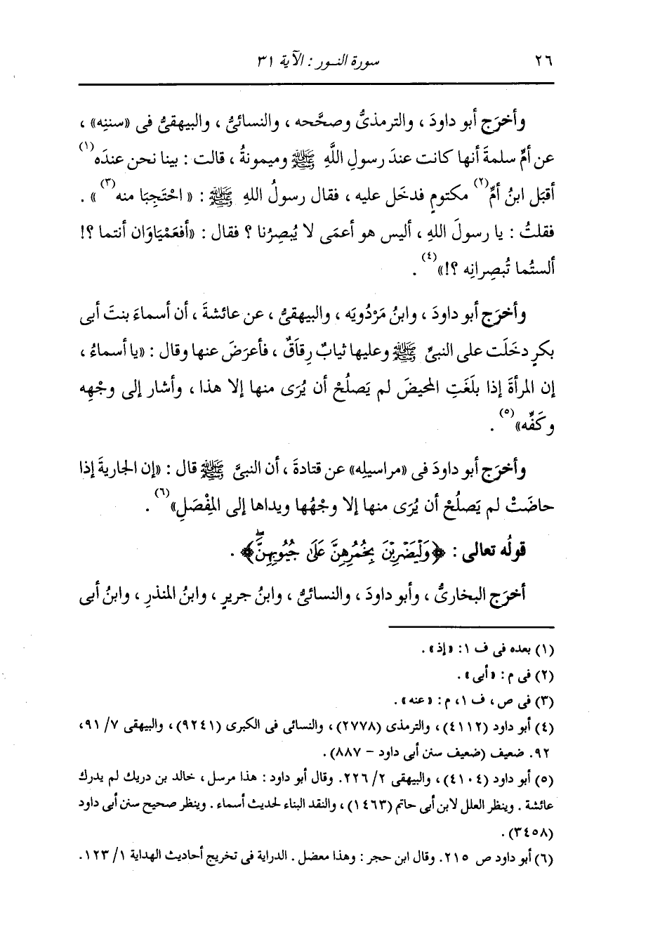 وأخرج أبو داود ، وَابن مردويه والبيهقي عن عائشة : ان أسماء بنت أبي بكر دخلت على النَّبِيّ صلى الله عليه وسلم وعليها ثياب رقاق فأعرض عنها وقال يا أسماء ان المرأة إذا بلغت المحيض لم يصلح ان يرى منها إلا هذا وأشار إلى وجهه وكفه.