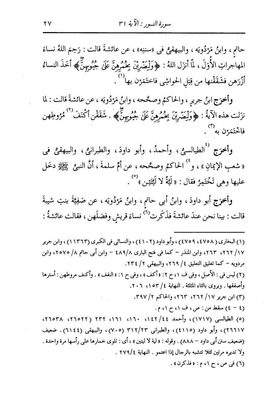 حاتم ، وَابن مردويه والبيهقي في "سُنَنِه" عن عائشة قالت : رحم الله نساء المهاجرات الاول ، لما أنزل الله {وليضربن بخمرهن على جيوبهن} أخذ النساء أزرهن فشققنها من قبل الحواشي فاختمرن بها.