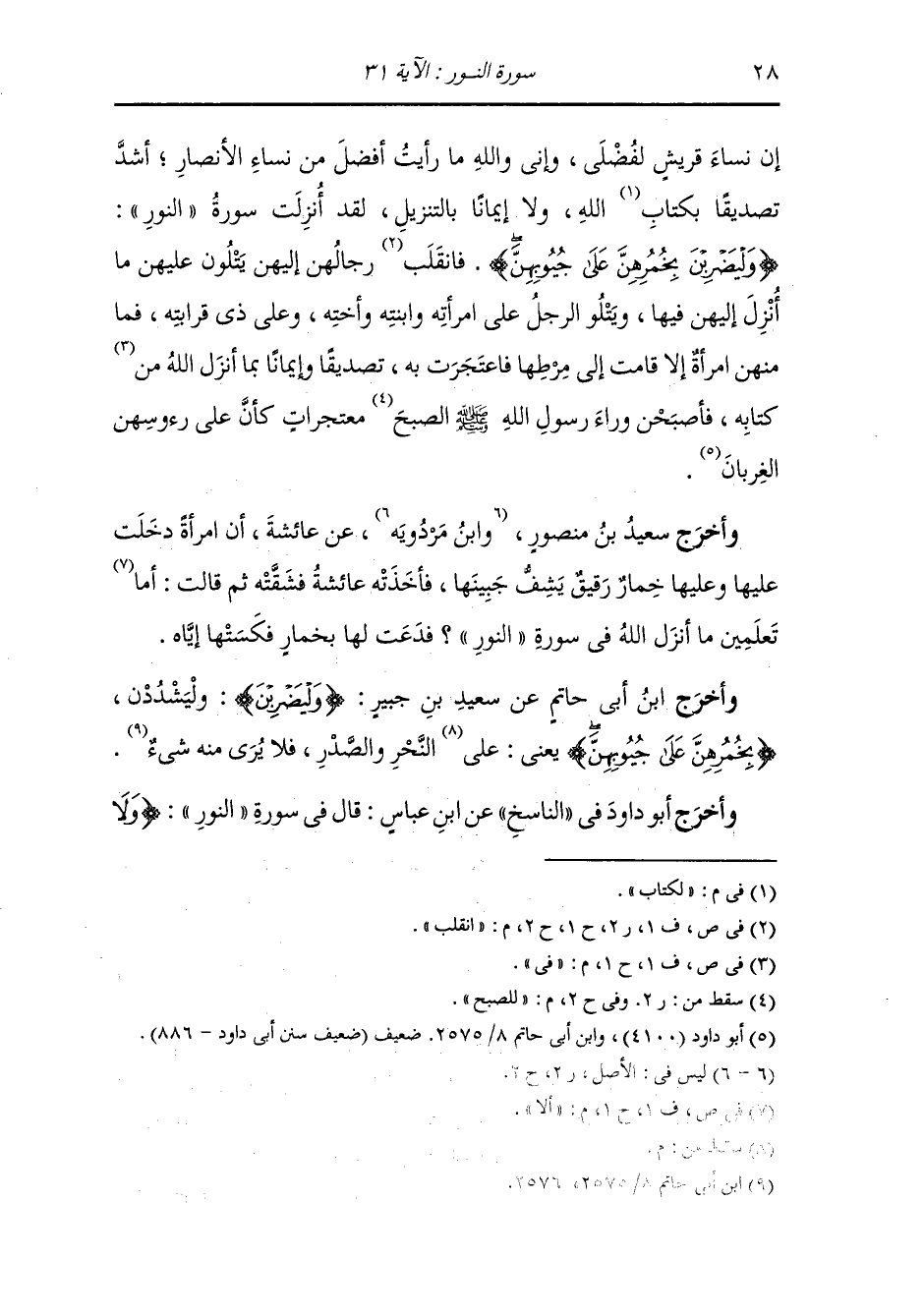ان نساء قريش لفضلي واني والله ما رأيت أفضل من نساء الانصار أشد تصديقا لكتاب الله ولا إيمانا بالتنزيل لقد أنزلت سورة النور {وليضربن بخمرهن على جيوبهن} انقلب رجالهن اليهن يتلون عليهن ما أنزل اليهن فيها ويتلو الرجل على امرأته وبنته