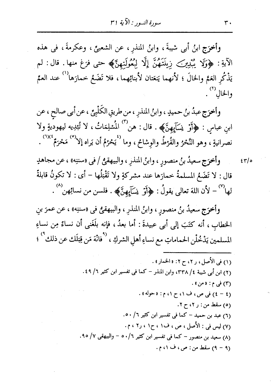وأخرج سعيد بن منصور والبيهقي في "سُنَنِه" ، وَابن المنذر عن عمر بن الخطاب رضي الله عنه أنه كتب إلى أبي عبيده أما بعد ، فانه بلغني أن نساء المسلمين يدخلن الحمامات مع نساء أهل الشرك