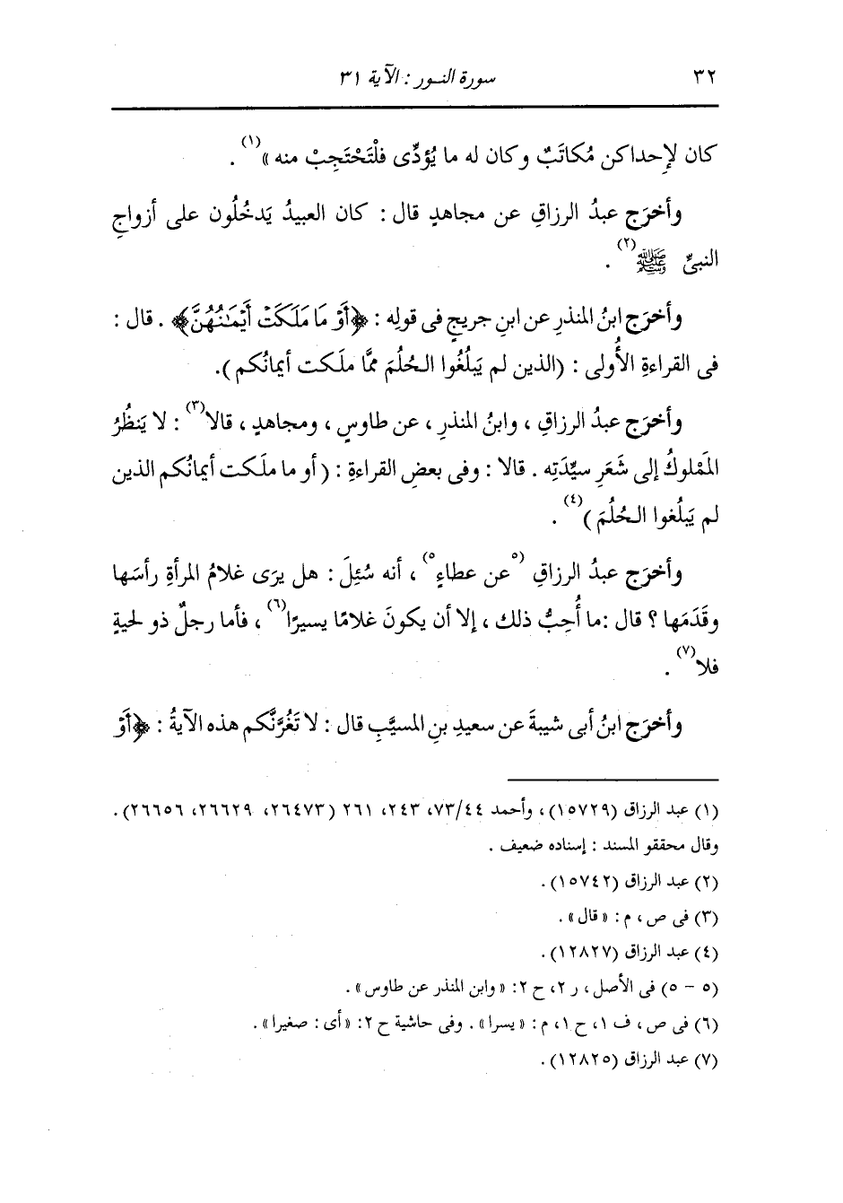 وأخرج عبد الرزاق ، وَابن المنذر ، عَن طاووس ومجاهد قال : لا ينظر المملوك لشعر سيدته قالا : وفي بعض القراءة (أو ما ملكت أيمانكم الذين لم يبلغوا الحلم).
