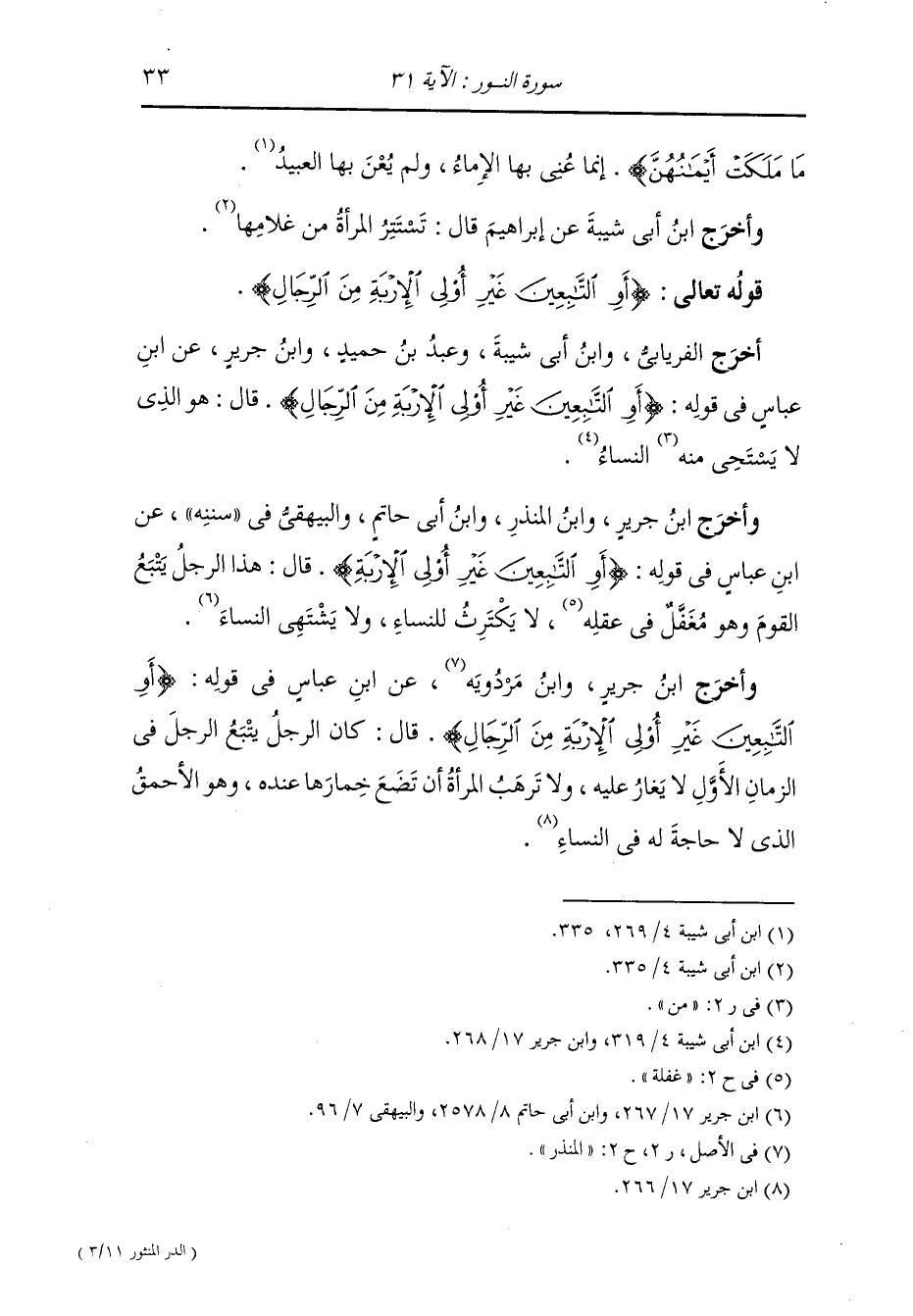 وأخرج ابن جرير ، وَابن مردويه عن ابن عباس في قوله {أو التابعين غير أولي الإربة من الرجال} قال كان الرجل يتبع الرجل في الزمان الأول لا يغار عليه ولا ترهب المرأة أن تضع خمارها عنده وهو الأحمق الذي لا حاجة له في النساء.