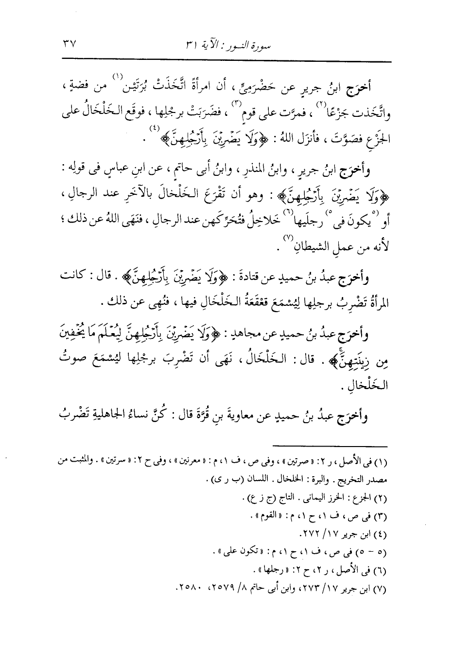 وأخرج أبن جرير عن حضرمي : ان امرأة اتخذت معرنين من فضة واتخذت جزعا فمرت على القوم فضربت برجلها فوقع الخلخال على الجزع فصوت فانزل الله {ولا يضربن بأرجلهن ليعلم ما يخفين من زينتهن}.