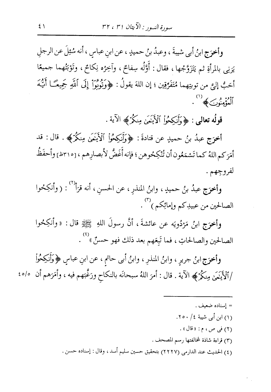 وأخرج عَبد بن حُمَيد ، وَابن المنذر عن الحسن انه قال : وانكحوا الصالحين من عبيدكم وامائكم.