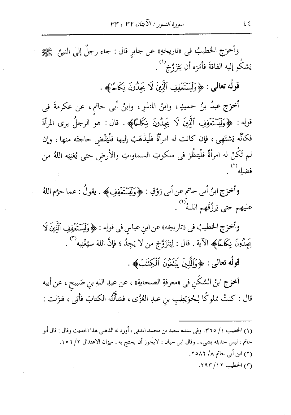 وأخرج الخطيب في تاريخه عن ابن عباس في قوله {وليستعفف الذين لا يجدون نكاحا} الآية قال : ليتزوج من لا يجد فان الله سيغنيه.