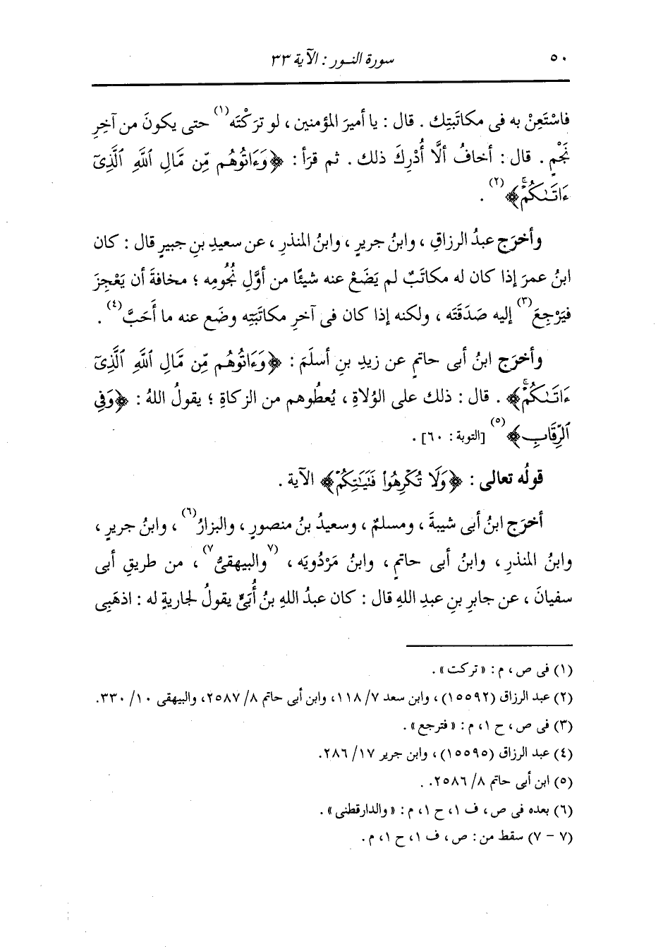 فاستعن به في مكاتبتك قال : يا أمير المؤمنين لو تركت حتى يكون من آخر نجم قال : أخاف ان لا أدرك ذلك ثم قرأ {وآتوهم من مال الله الذي آتاكم}.