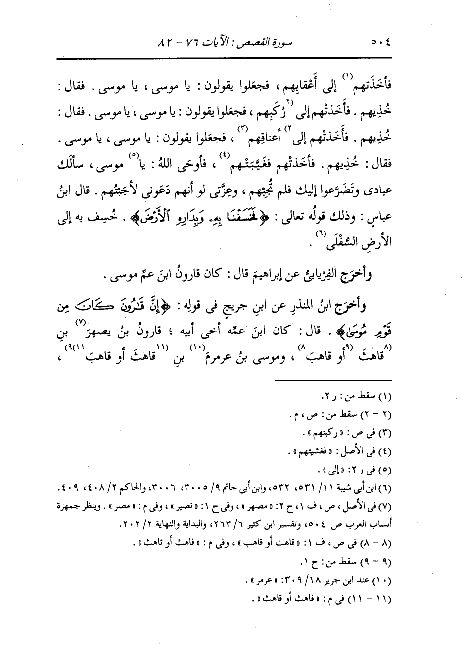 وأخرج عَبد بن حُمَيد ، وَابن أبي حاتم عن قتادة رضي الله قال : كان قارون ابن عم موسى أخي أبيه وكان قطع البحر مع بني اسرائيل وكان يسمى النور من حسن صوته بالتوراة ولكن عدو الله نافق كما نافق السامري فأهلكه الله ببغيه ، وإنما بغى لكثرة ماله وولده.