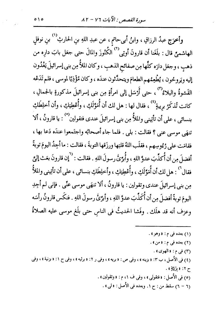 السلام وكان موسى عليه السلام شديد الغضب ، فلما بلغه توضأ ثم صلى وسجد وبكى وقال : يا رب ، عدوك قارون كان لي مؤذيا فذكر أشياء ثم لن يناه حتى أراد فضيحتي ، يا رب سلطني عليه ، فأوحى الله اليه : ان مر الأرض بما شئت تطعك ، فجاء موسى إلى قارون فلما رآه قارون عرف الغضب في وجهه فقال : يا موسى ارحمني فقال موسى عليه السلام : يا أرض خذيهم فاضطربت داره وخسف به وبأصحابه حتى تغيبت أقدامهم وساخت دارهم على قدر ذلك فقال قارون : يا موسى ارحمني فقال : يا أرض خذيهم فخسف به وبداره وبأصحابه فلما خسف به قيل له : يا موسى ما أفظك أما وعزتي لو إياي دعا لرحمته