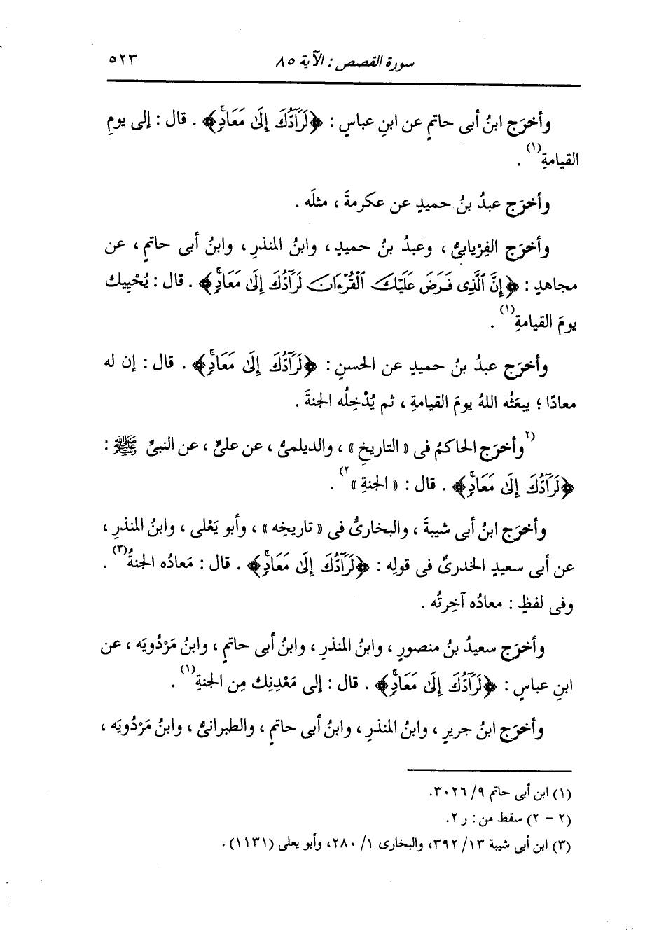 عن ابن عباس {إن الذي فرض عليك القرآن لرادك إلى معاد} قال : لرادك إلى الجنة ثم سائلك عن القرآن.