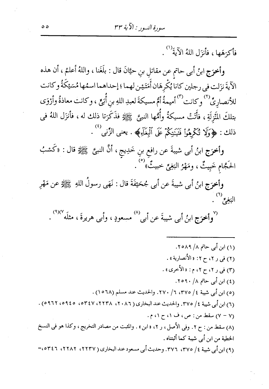 وأخرج ابن أبي حاتم عن مقاتل بن حيان قال : بلغنا - والله أعلم - أن هذه الآية نزلت في رجلين كانا يكرهان أمتين لهما إحداهما اسمها مسيكة وكانت للأنصاري والأخرى أميمة أم مسيكة لعبد الله بن أبي وكانت معاذة وأروى بتلك المنزلة فاتت مسيكة وامها النَّبِيّ صلى الله عليه وسلم فذكرتا ذلك له فانزل الله في ذلك {ولا تكرهوا فتياتكم على البغاء} يعني الزنا.