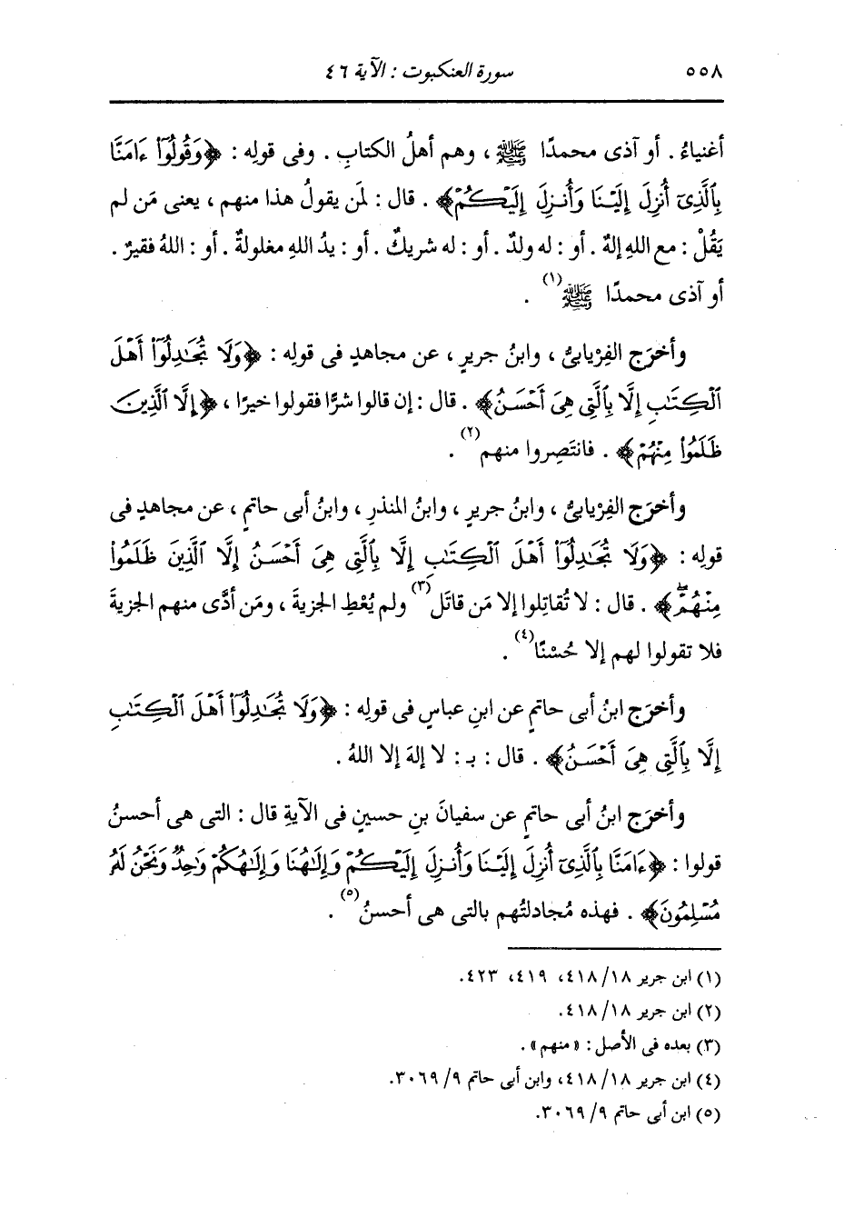 وأخرج أبو داود في ناسخه ، وَابن جَرِير ، وَابن المنذر ، وَابن أبي حاتم ، وَابن الانباري في المصاحف عن قتادة {ولا تجادلوا أهل الكتاب إلا بالتي هي أحسن} قال : نهى عن مجادلتهم في هذه الآية ، ثم نسخ ذلك فقال {قاتلوا الذين لا يؤمنون بالله ولا باليوم الآخر} ولا مجادلة أشد من السيف.