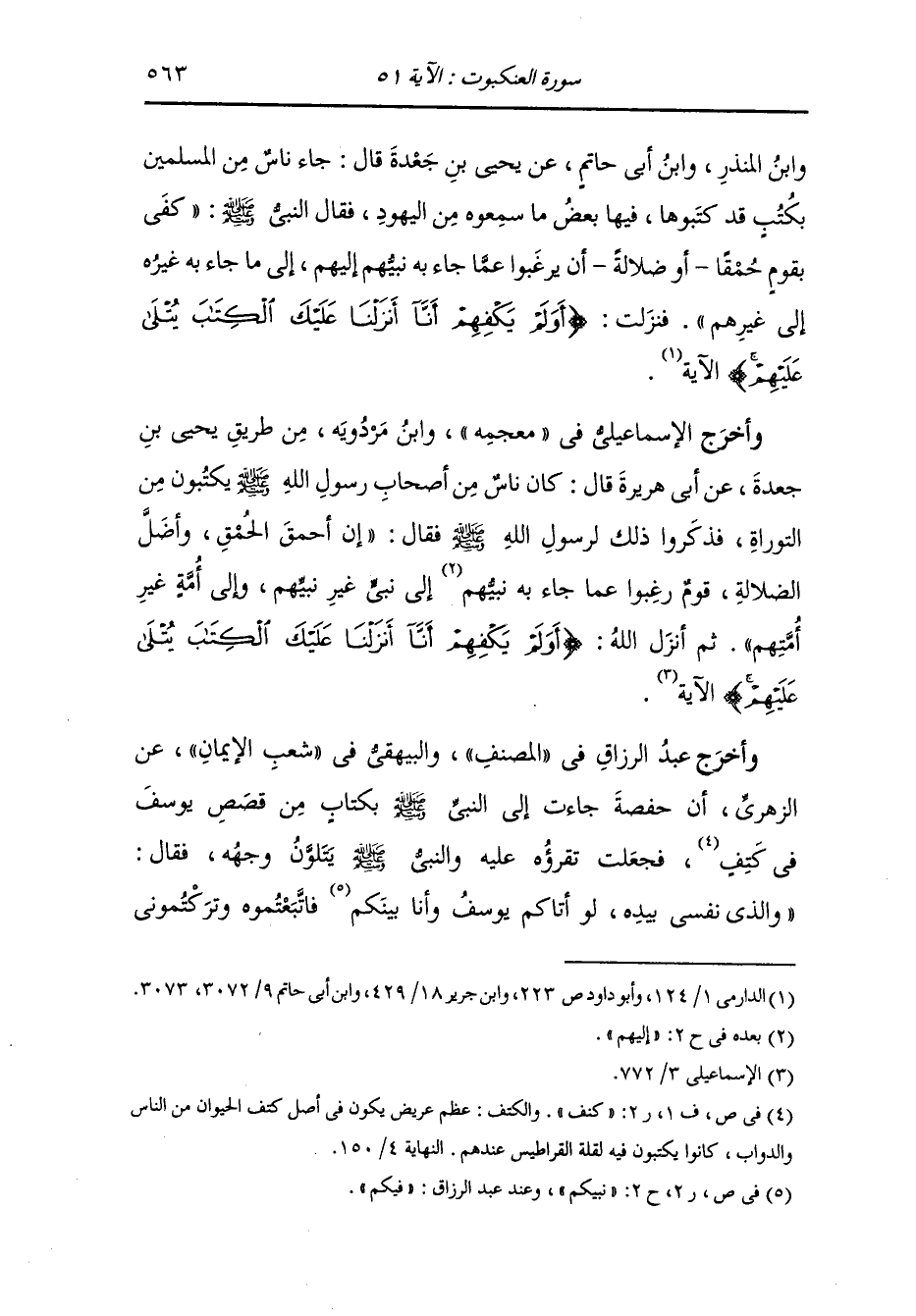 وأخرج عبد الرزاق والبيهقي عن أبي قلابة ان عمر بن الخطاب رضي الله عنه مر برجل يقرأ كتابا فاستمعه ساعة فاستحسنه فقال للرجل : اكتب لي من هذا الكتاب قال : نعم ، فاشترى أديما فهيأه ثم جاء به اليه فنسخ له في ظهره وبطنه ثم أتى النَّبِيّ صلى الله عليه وسلم فجعل يقرأه عليه وجعل وجه رسول الله صلى الله عليه وسلم يتلون فضرب رجل من الانصار بيده الكتاب وقال : ثكلتك أمك يا ابن