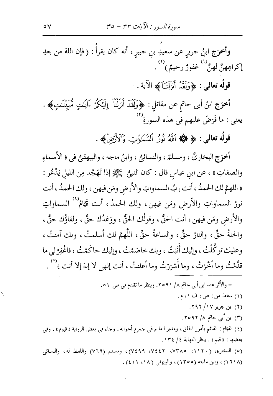 أخرج البخاري ومسلم والنسائي ، وَابن ماجه والبيهقي في الاسماء والصفات عن ابن عباس قال : كان رسول الله صلى الله عليه وسلم اذا تهجد في الليل يدعو اللهم لك الحمد أنت رب السموات والارض ومن فيهن ولك الحمد أنت نور السموات والارض ومن فيهن ولك الحمد أنت قيام السموات والارض ومن فيهن أنت الحق وقولك حق ووعدك حق ولقاؤك حق والجنة حق والنار حق والساعة حق الله لك أسلمت وبك آمنت وعليك توكلت واليك أنبت وبك خاصمت واليك حاكمت فاغفر لي ما قدمت وما أخرت وما أسررت وما أعلنت أنت الهي لا إله إلا أنت.