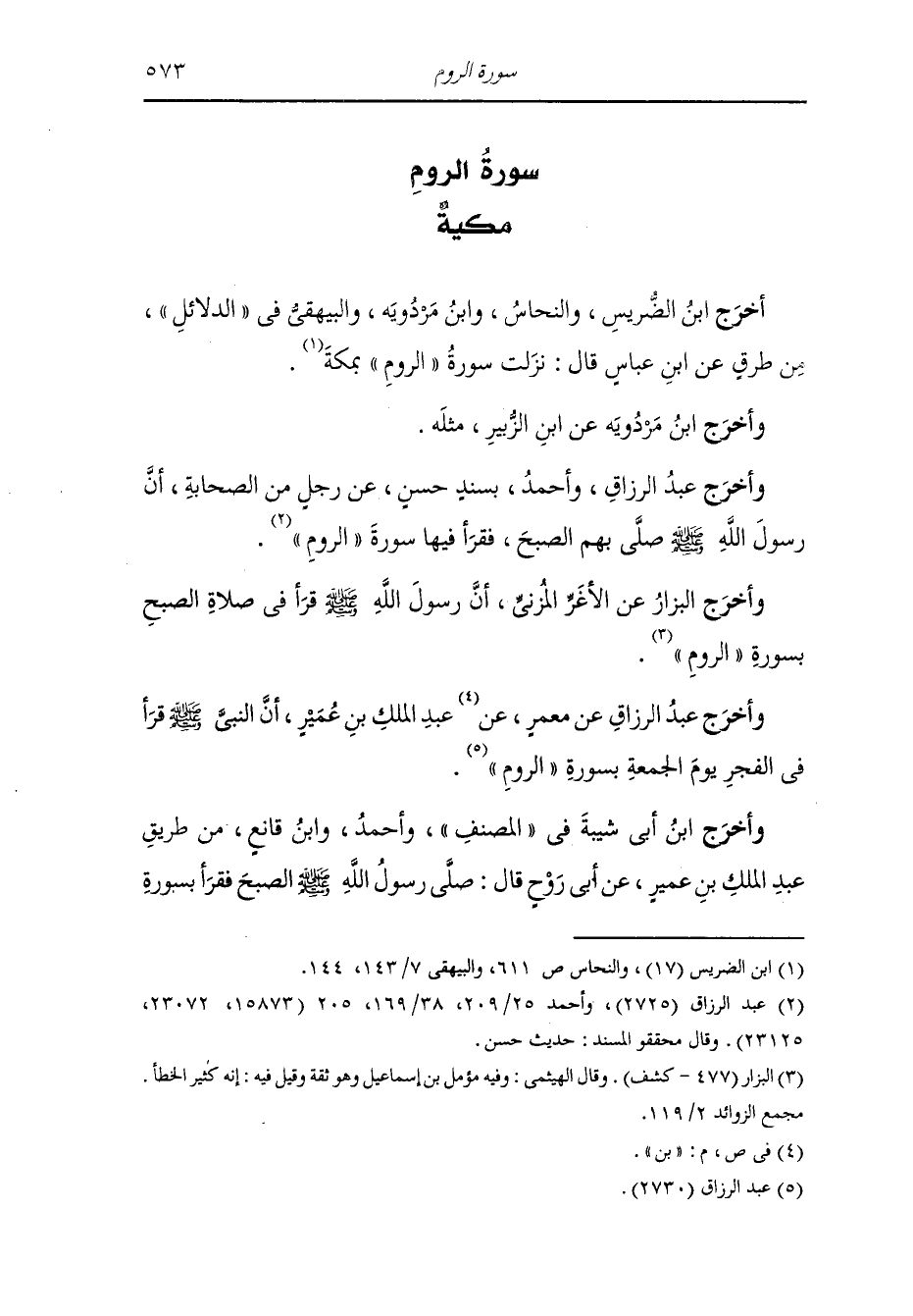 أخرج أحمد والترمذي وحسنه والنسائي ، وَابن المنذر ، وَابن أبي حاتم والطبراني في الكبير والحاكم وصححه ، وَابن مردويه والبيهقي في الدلائل والضياء عن ابن عباس رضي الله عنهما في قوله {الم غلبت الروم} قال : غلبت ، وغلبت قال : كان المشركون يحبون أن تظهر فارس على الروم لأنهم أصحاب أوثان وكان المسلمون يحبون أن تظهر الروم على فارس لأنهم أصحاب كتاب فذكروه لابي بكر رضي الله عنه فذكره أبو بكر لرسول الله صلى الله عليه وسلم فقال رسول الله صلى الله عليه وسلم أما انهم سيغلبون فذكره أبو بكر رضي الله عنه لهم فقالوا : اجعل بيننا وبينك أجلا فان ظهرنا كان لنا كذا وكذا وان ظهرتم كان لكم كذا وكذا ، فجعل بينهم أجلا خمس سنين فلم يظهروا فذكر ذلك أبو بكر لرسول الله صلى الله عليه وسلم فقال : إلا جعلته أراه قال : دون العشر فظهرت الروم بعد ذلك فذلك قوله {الم غلبت الروم} فغلبت ثم غلبت بعد ، يقول الله {لله الأمر من قبل ومن بعد ويومئذ يفرح المؤمنون بنصر الله} قال سفيان : سمعت أنهم قد ظهروا عليهم يوم بدر.
