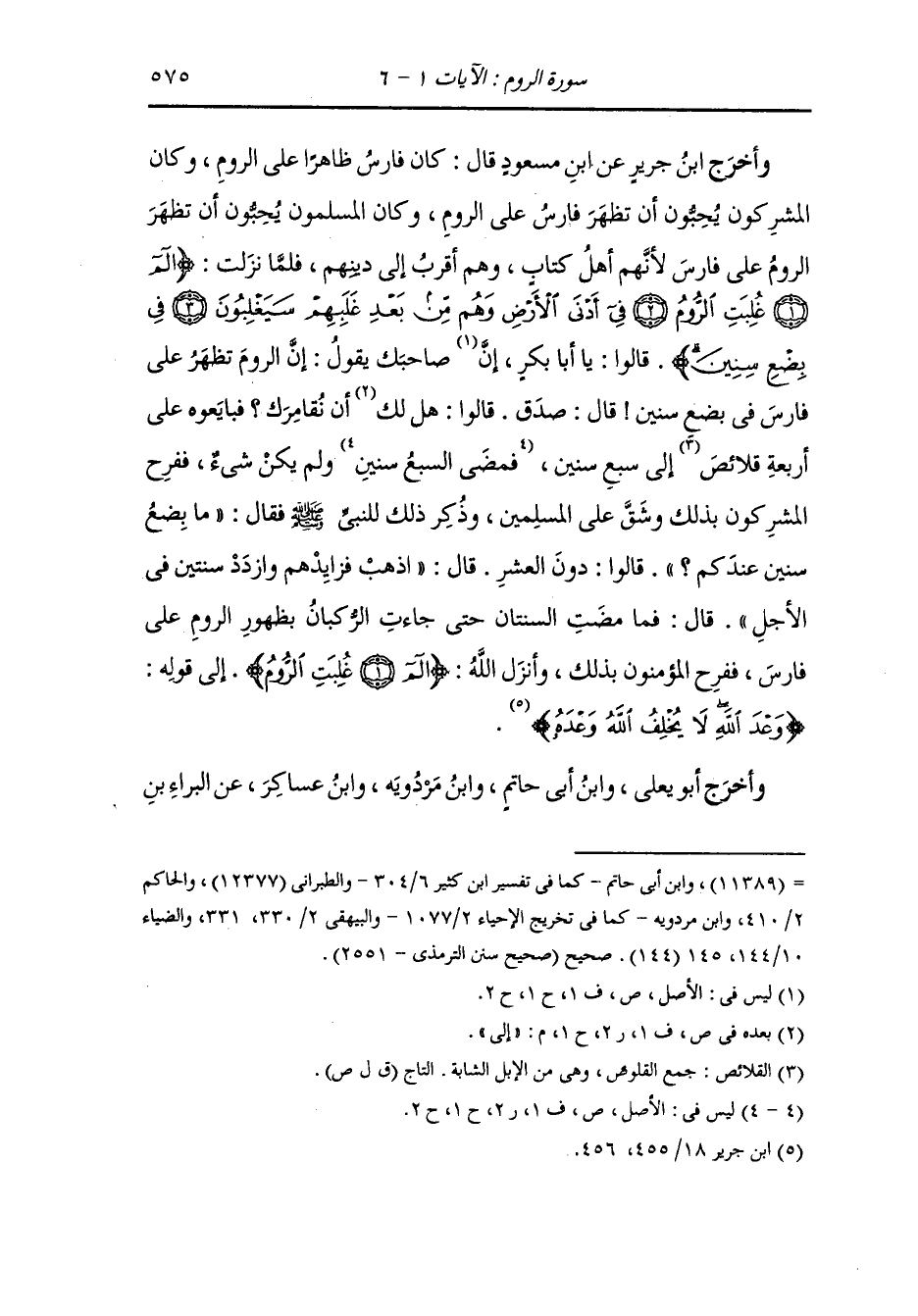 وأخرج الترمذي وصححه والدار قطني في الافراد والطبراني ، وَابن مردويه وأبو نعيم في الدلائل والبيهقي في شعب الايمان عن يسار بن مكرم السلمي قال : لما نزلت {الم غلبت الروم} ، كانت