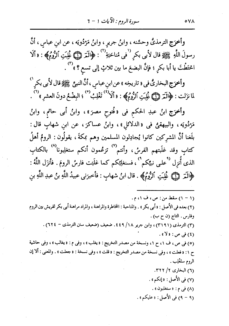 عتبة بن مسعود قال : انه لما نزلت هاتان الآيتان فأمر أبو بكر بعض المشركين - قبل أن يحرم القمار - على شيء ان لم تغلب الروم فارس في بضع سنين فقال رسول الله صلى الله عليه وسلم لم فعلت فكل ما دون العشر بضع فكان ظهور فارس على الروم في سبع سنين ثم أظهر الله الروم على فارس زمن الحديبية ففرح المسلمون بظهور أهل الكتاب.