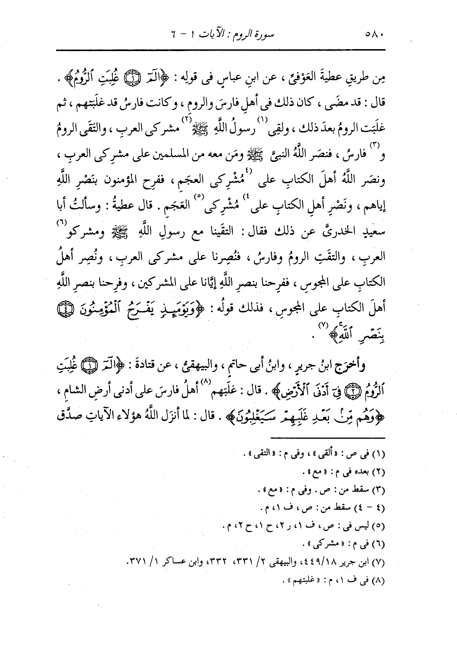 وأخرج ابن أبي حاتم والبيهقي عن الزبير الكلابي قال : رأيت غلبة فارس الروم ثم رأيت غلبة الروم فارس ثم رأيت غلبة المسلمين فارس والروم وظهورهم على الشام والعراق ، كل ذلك في خمس عشرة سنة.