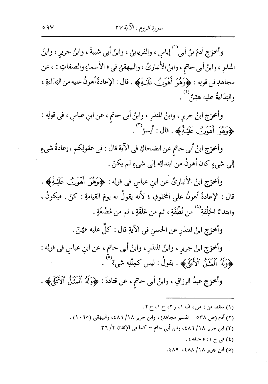 وأخرج ابن جرير ، وَابن أبي حاتم عن قتادة رضي الله عنه {وله المثل الأعلى} قال : مثله انه لا اله إلا هو ولا معبود غيره.