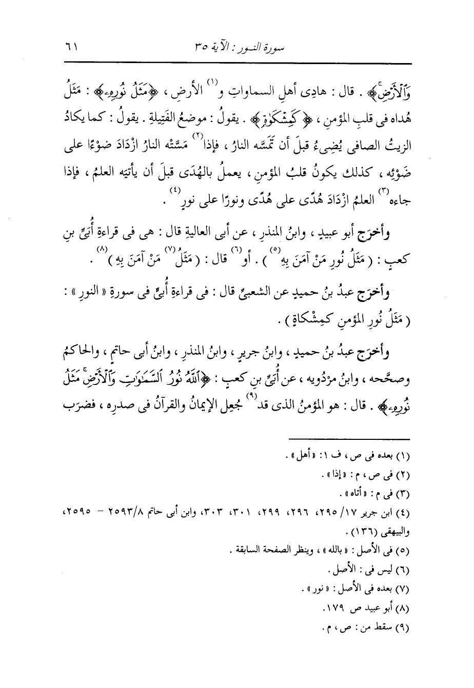 وأخرج عَبد بن حُمَيد ، وَابن جَرِير ، وَابن المنذر ، وَابن أبي حاتم ، وَابن مردويه والحاكم وصححه عن أبي بن كعب {الله نور السماوات والأرض مثل نوره} قال : هو المؤمن الذي جعل الايمان والقرآن في صدره فضرب
