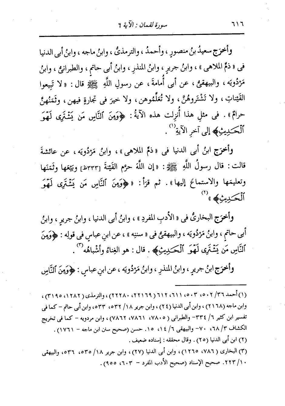وأخرج ابن أبي شيبه ، وَابن أبي الدنيا ، وَابن جَرِير ، وَابن المنذر والحاكم وصححه والبيهقي في شعب الايمان عن أبي الصهباء قال : سألت عبد الله بن مسعود رضي الله تعالى عنه عن قوله تعالى {ومن الناس من يشتري لهو الحديث} قال : هو - والله - الغناء.