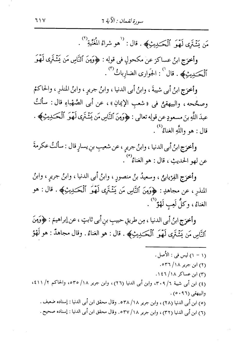 وأخرج ابن أبي حاتم عن عطاء الخراساني رضي الله عنه {ومن الناس من يشتري لهو الحديث} قال : الغناء والباطل.