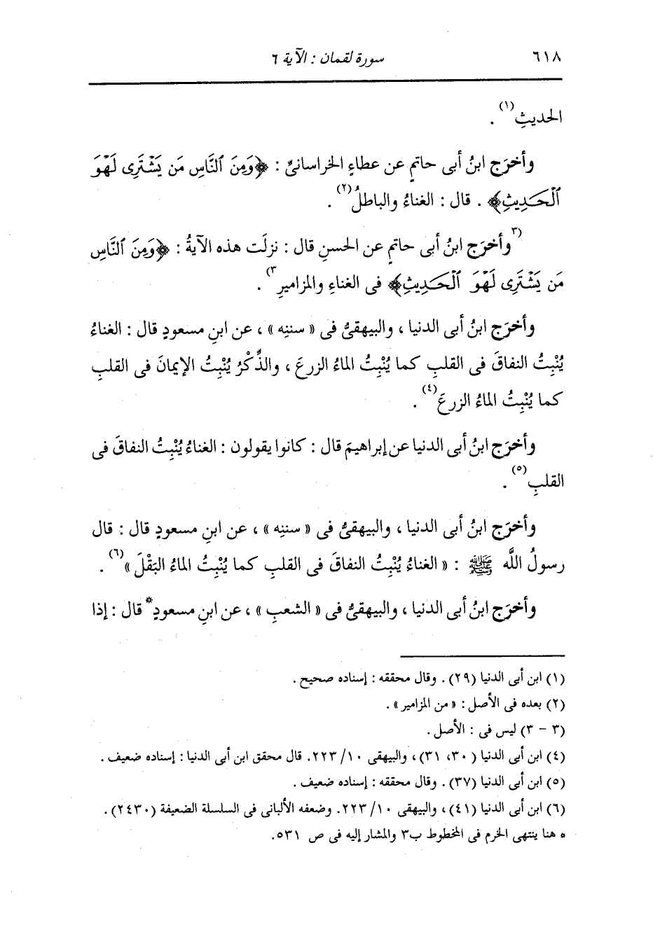 وأخرج ابن أبي الدنيا ، وَابن مردويه عن أبي امامة رضي الله عنه ، أن رسول الله صلى الله عليه وسلم قال : ما رفع أحد صوته بغناء إلا بعث الله اليه شيطانين يجلسان على منكبيه يضربان باعقابهما على صدره حتى يمسك.