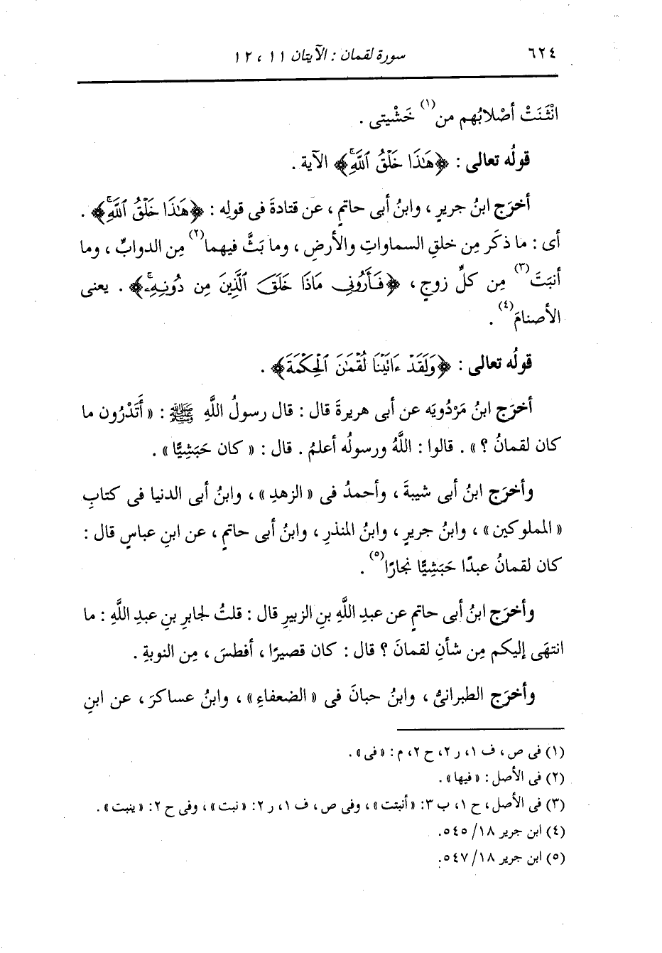 وأخرج ابن جرير عن عبد الرحمن ابن حرملة قال : جاء أسود إلى سعيد بن المسيب رضي الله عنه يسأله فقال له سعيد رضي الله عنه : لا تحزن من أجل انك أسود فانه كان من أخير الناس ثلاثة من السودان : بلال ، ومهجع مولى عمر بن الخطاب ، ولقمان الحكيم كان أسود نوبيا ذا مشافر.